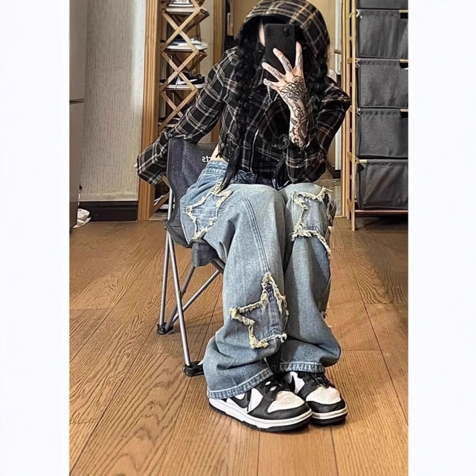 アメリカンレトロスタージーンズ男性と女性のための韓国版インミッドウエストスリムローエッジ刺繍ストレートワイドレッグパンツトレンディ