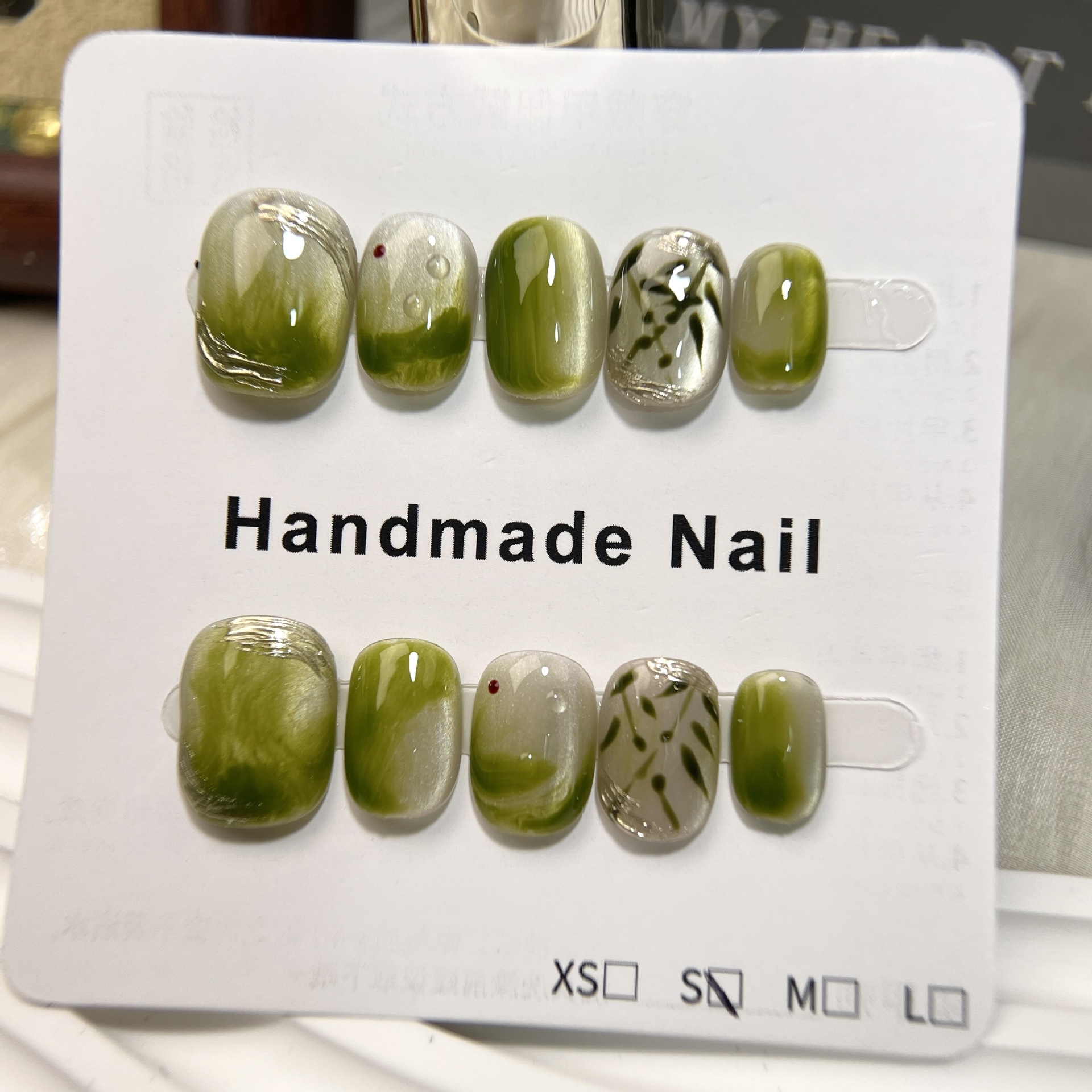 猫眼甲新款玻璃珠绿色美甲店手工穿戴甲高级感纯手工批发美甲贴片