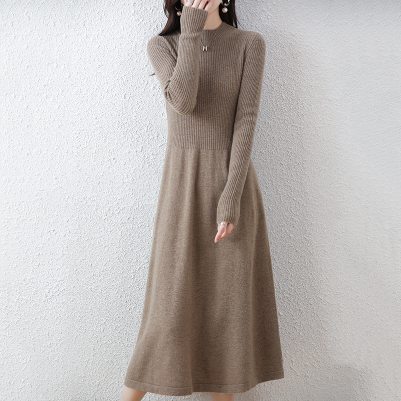 100純ウールワンピース秋冬新作気質半高襟カジュアルベーススカート長袖セーターニットロングスカート