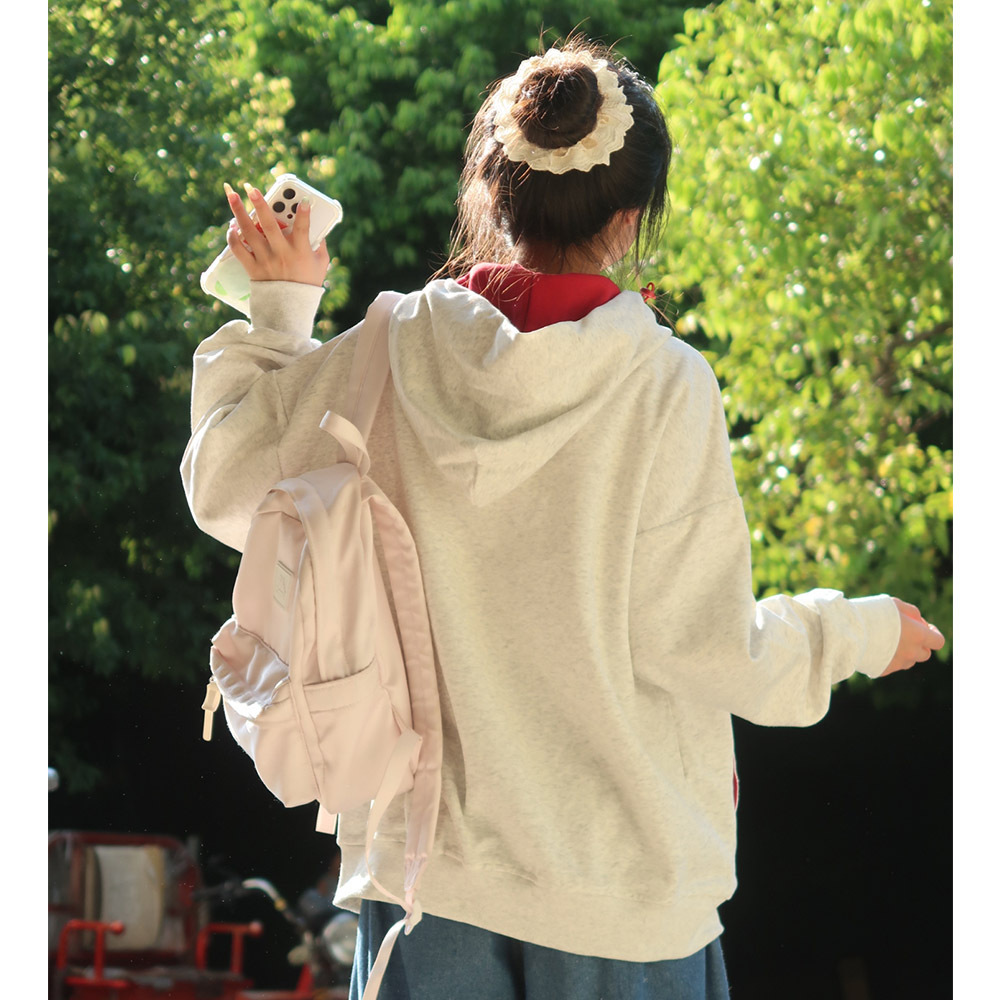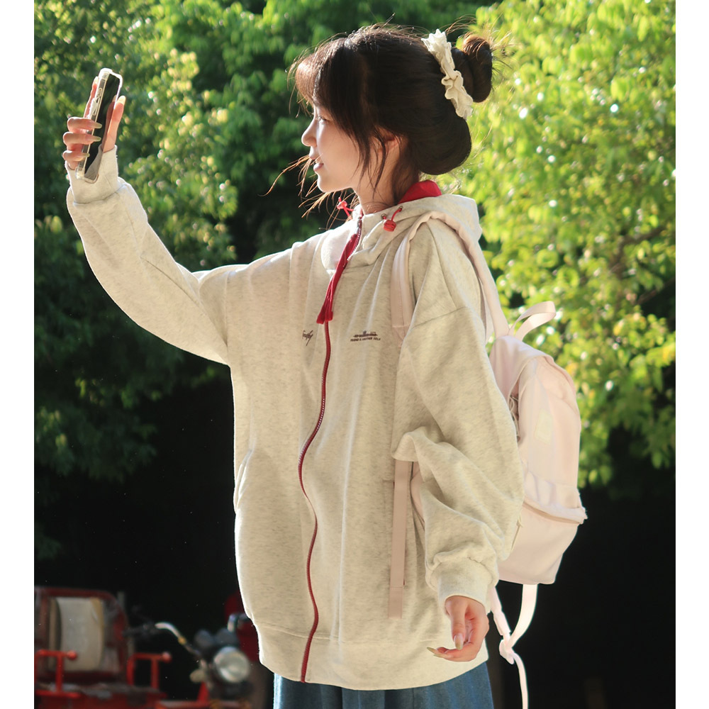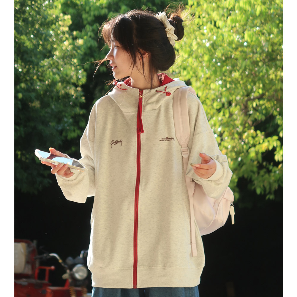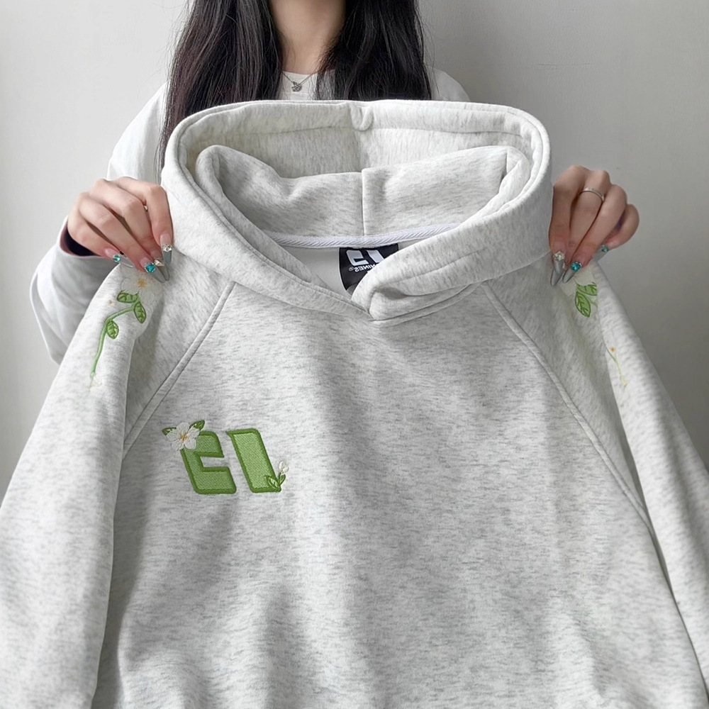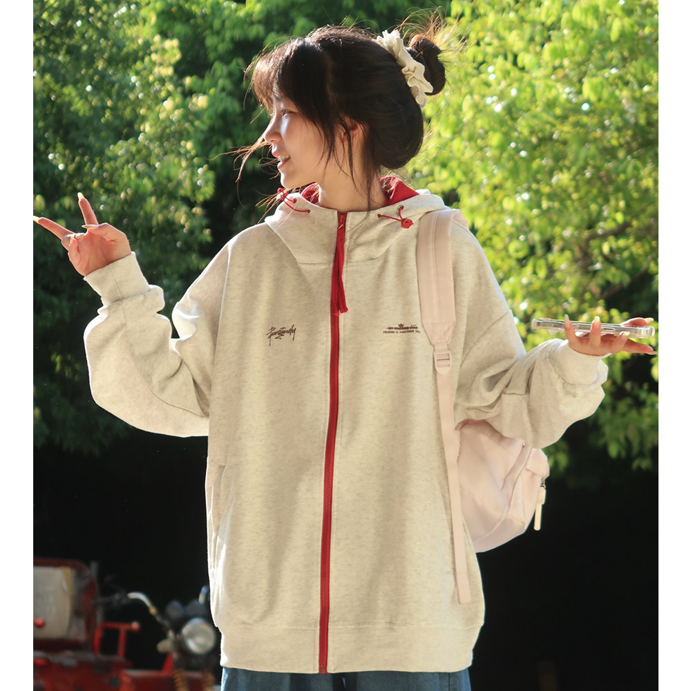 国潮牌美式白灰色刺绣纯棉卫衣女秋季薄款宽松连帽小众高街外套女