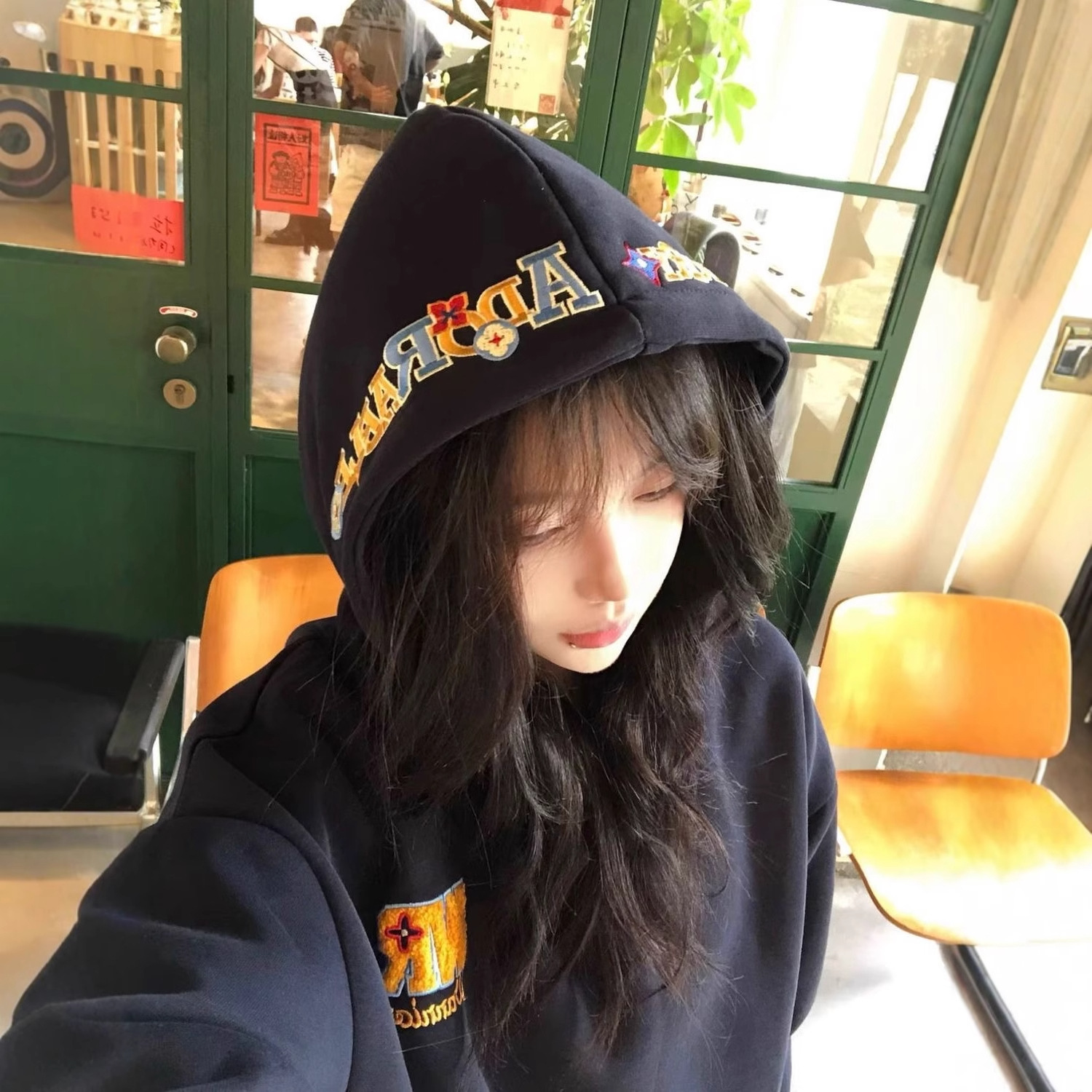 美式高街复古字母刺绣连帽卫衣女秋冬国潮牌高级感宽松情侣装外套