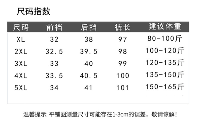 尺码 XL建议90—105斤,XXL建议105—120斤,3XL建议120—135斤,4XL建议135—150斤,5XL建议150—165斤