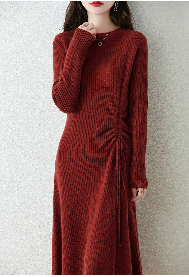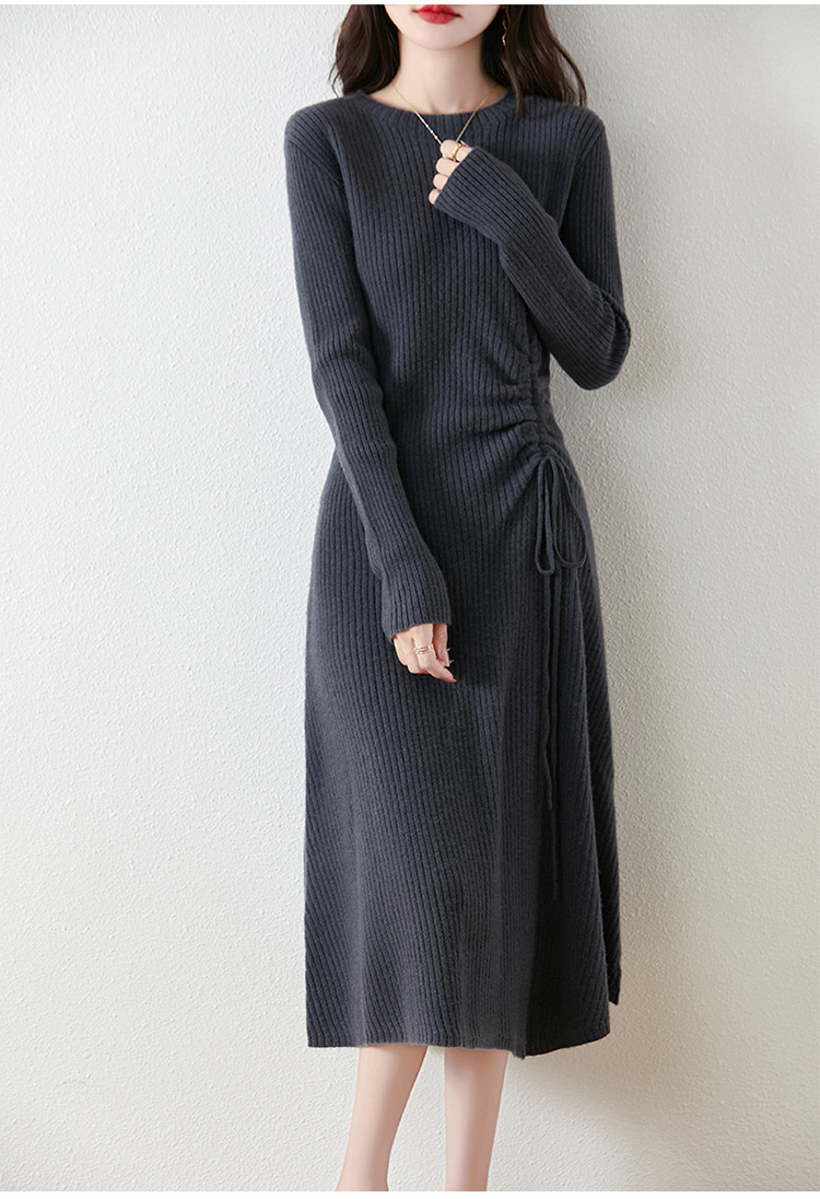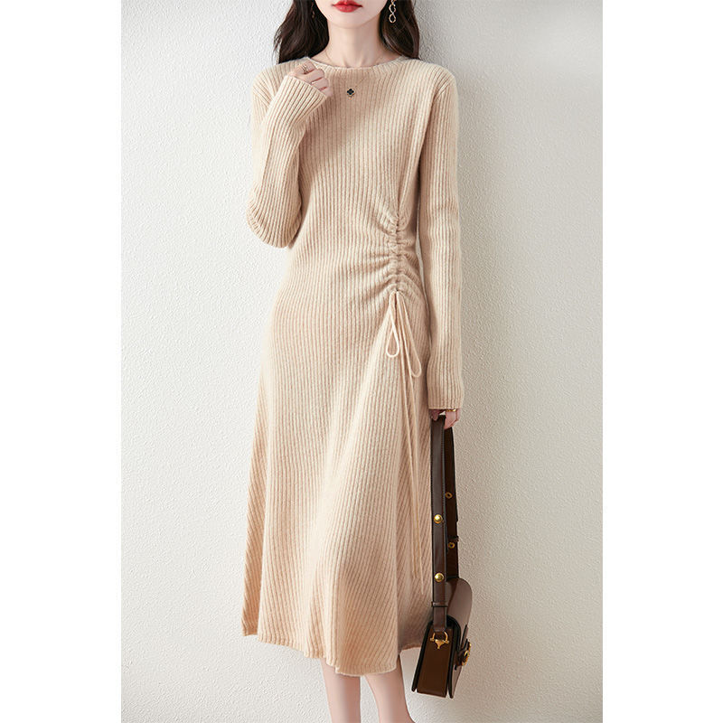 秋冬气质中长款过膝连衣裙女显瘦打底针织裙收腰抽绳过膝毛衣裙女