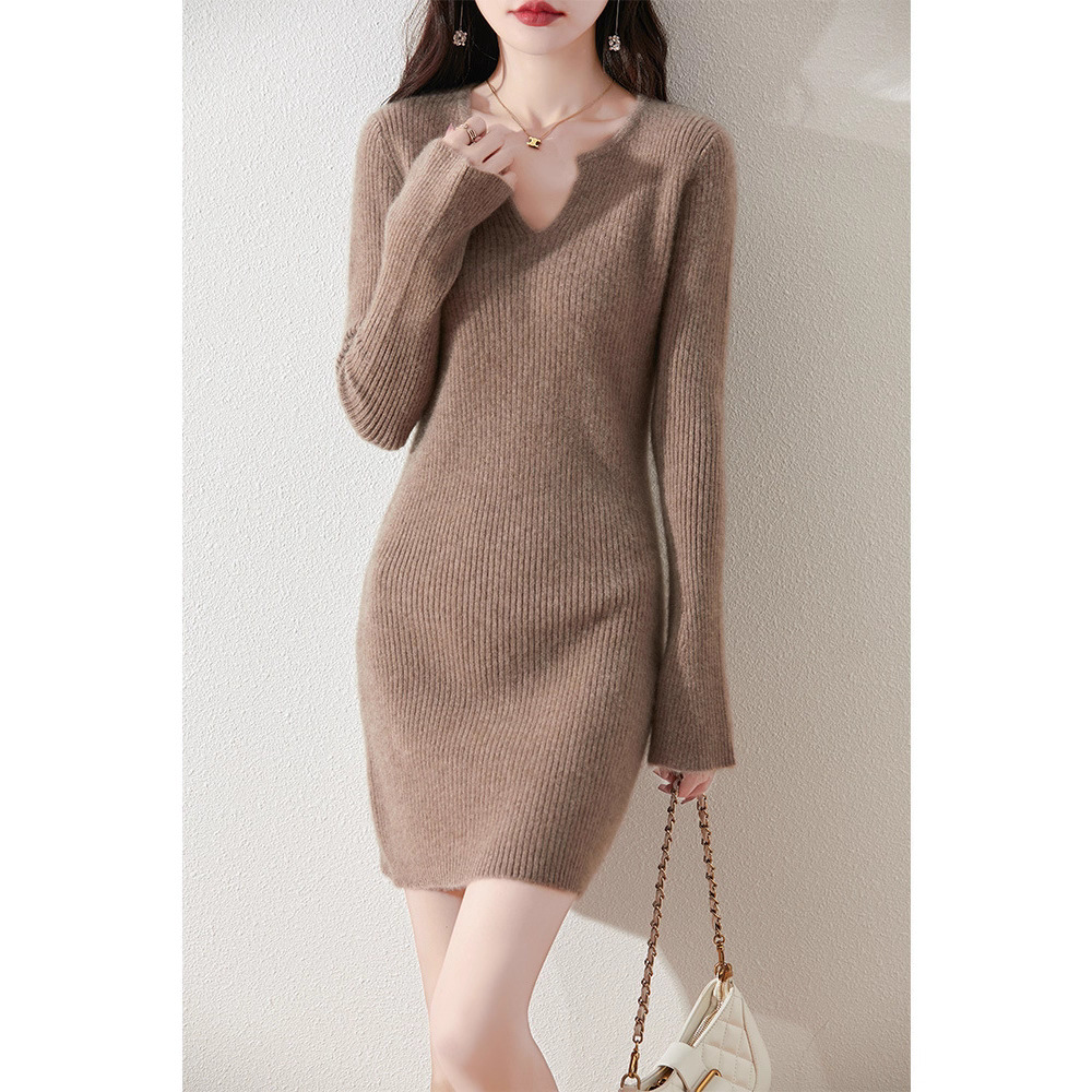 纯色v领中长款针织连衣裙女秋冬新款气质修身显瘦过膝打底毛衣裙