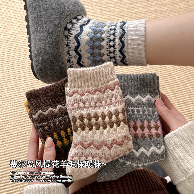 羊毛费尔岛袜子女中筒袜秋冬款加厚加绒保暖羊绒日系复古冬天长袜
