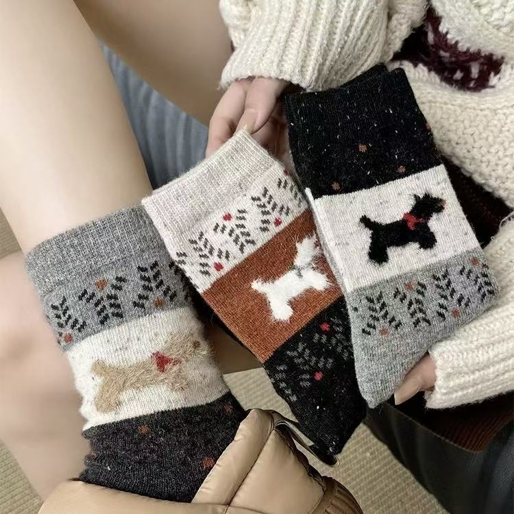 复古费尔岛小狗撞色秋冬加绒氛围中筒袜点子纱卡通可爱毛绒袜批发