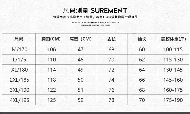 尺码 170/M,175/L,180/XL,185/2XL,190/3XL,195/4XL