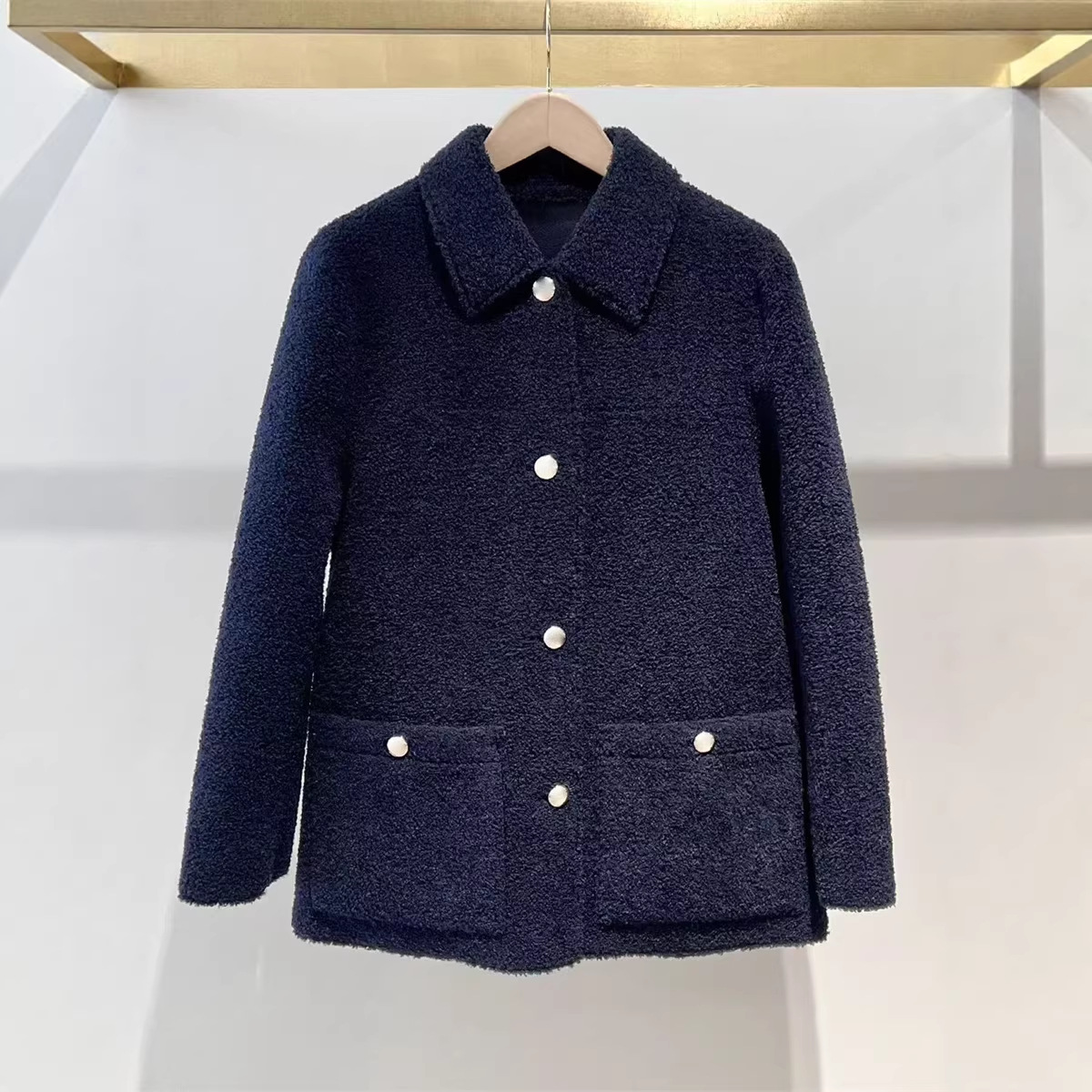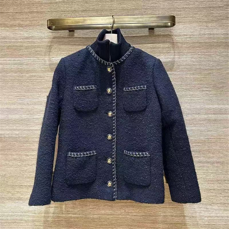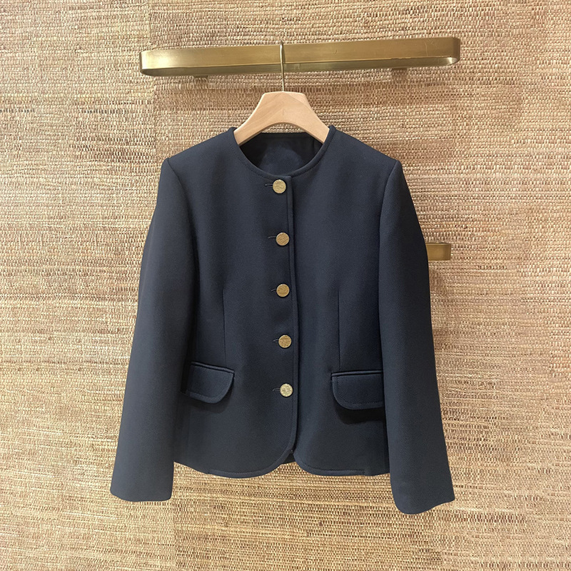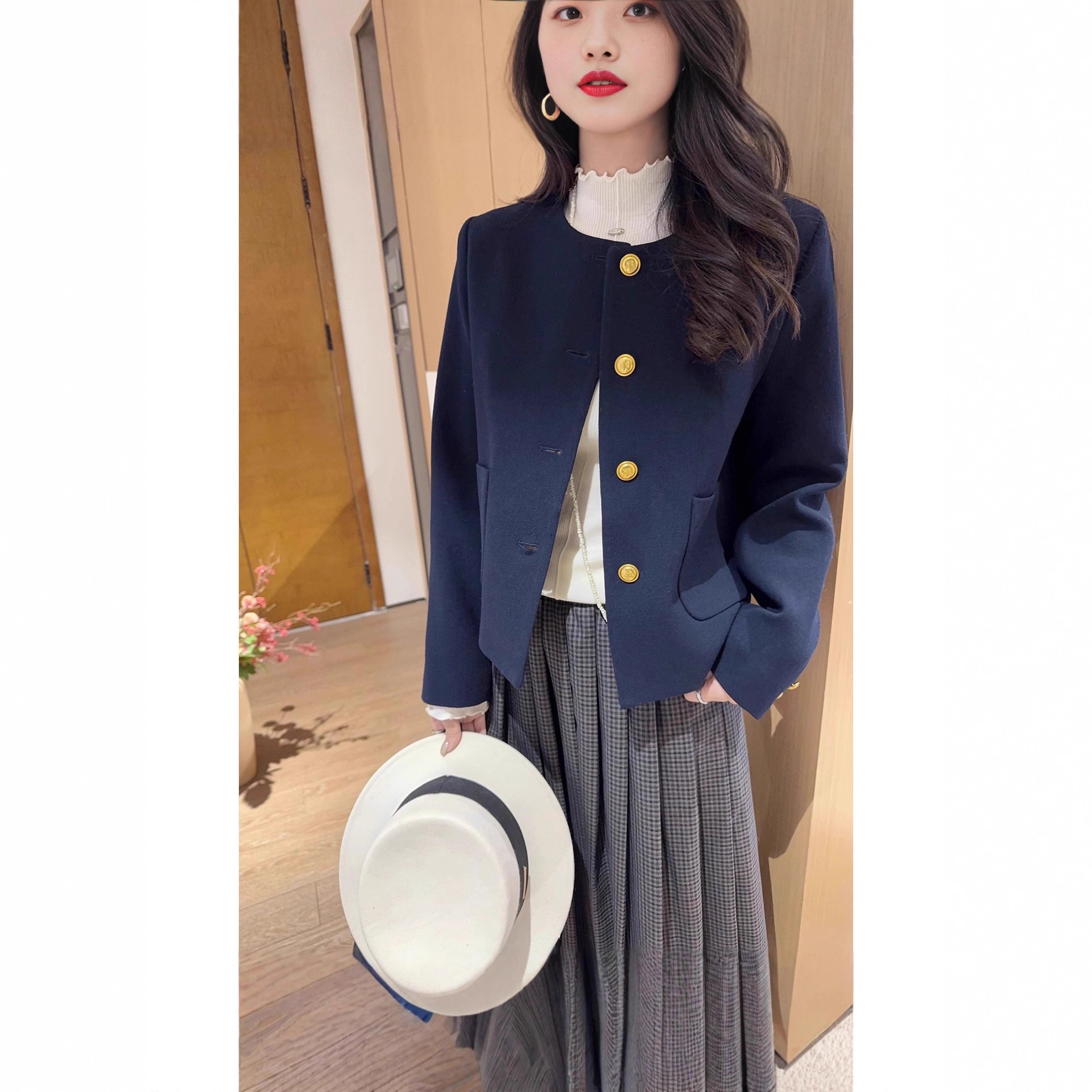 法式小众 2025秋冬新款深蓝正装圆领金属扣装饰直肩修身短外套
