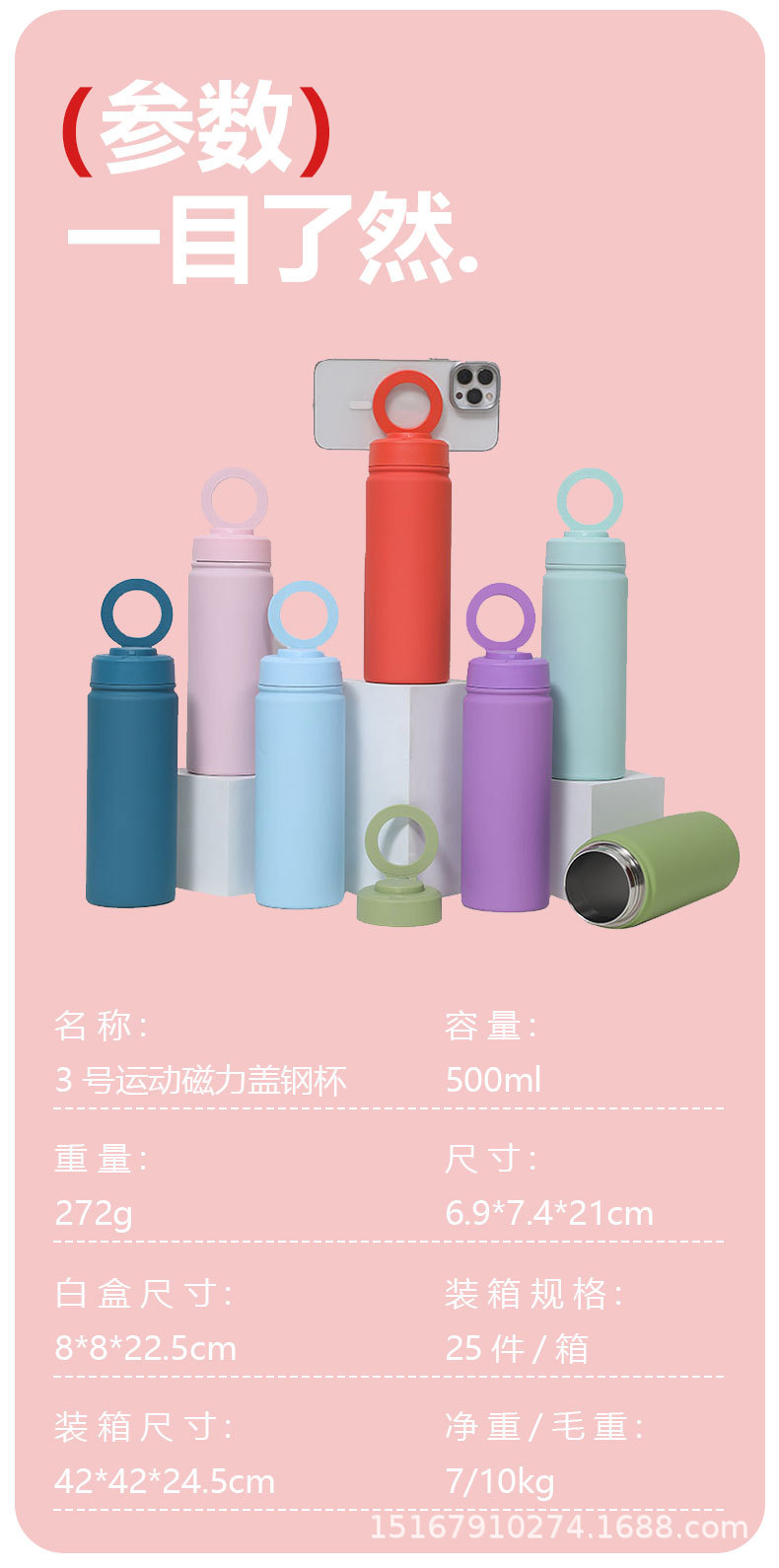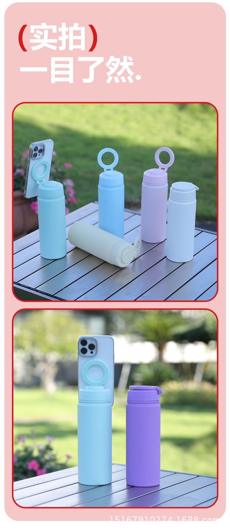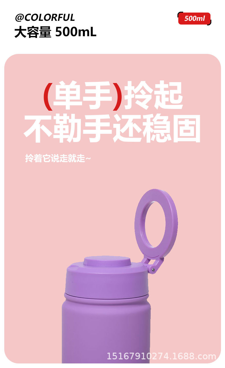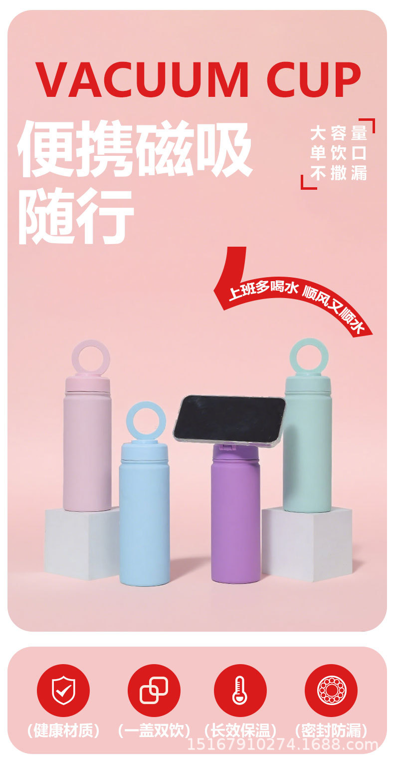 跨境新款500ml手机磁吸支架水杯 户外真空运动水壶 不锈钢保温杯
