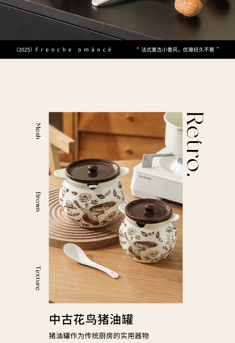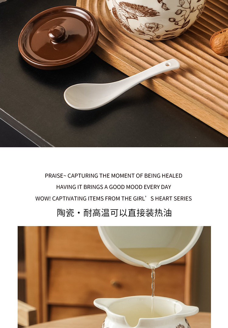 轻奢花卉陶瓷猪油罐带勺子滤网耐高温辣椒罐家用高颜值厨房调料罐