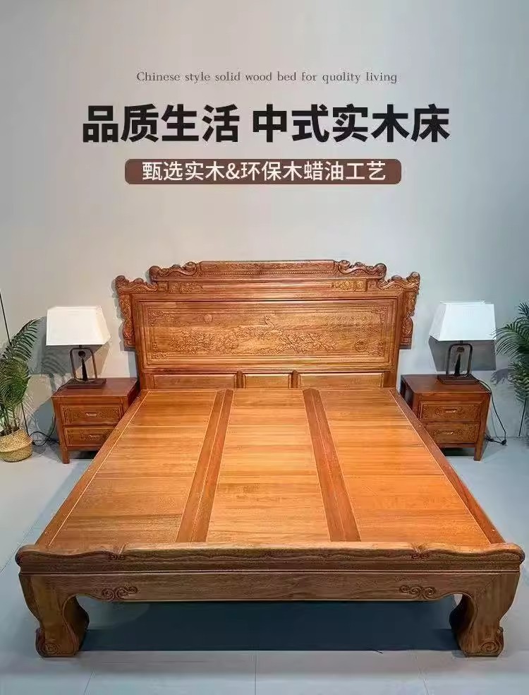 全榫卯花梨木环保木蜡油实木床1米8明清古典加厚大款雕花主卧大床
