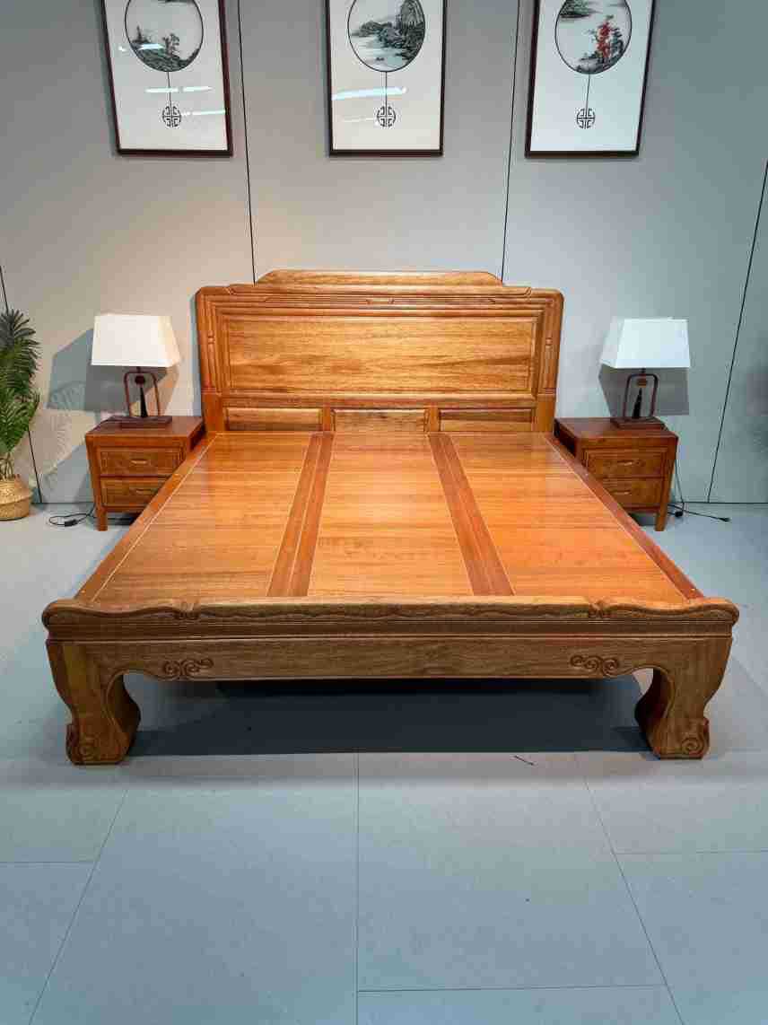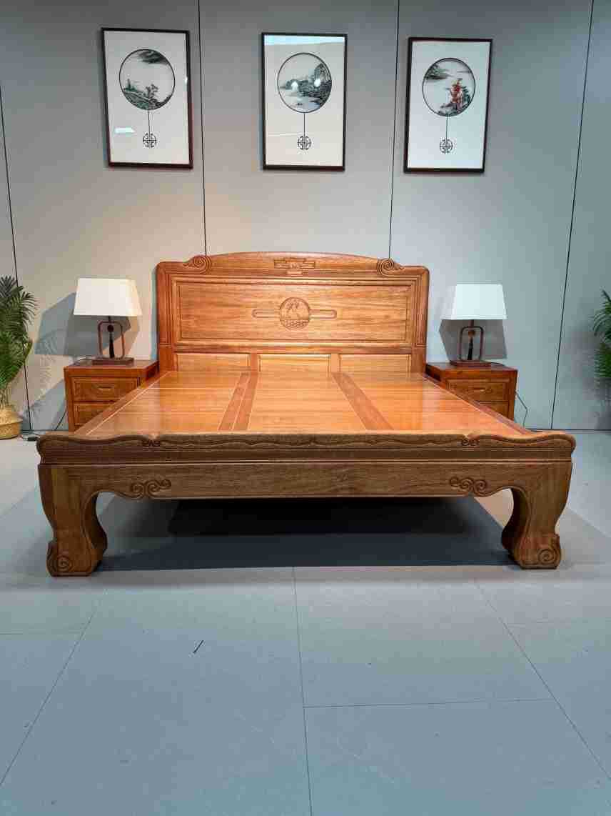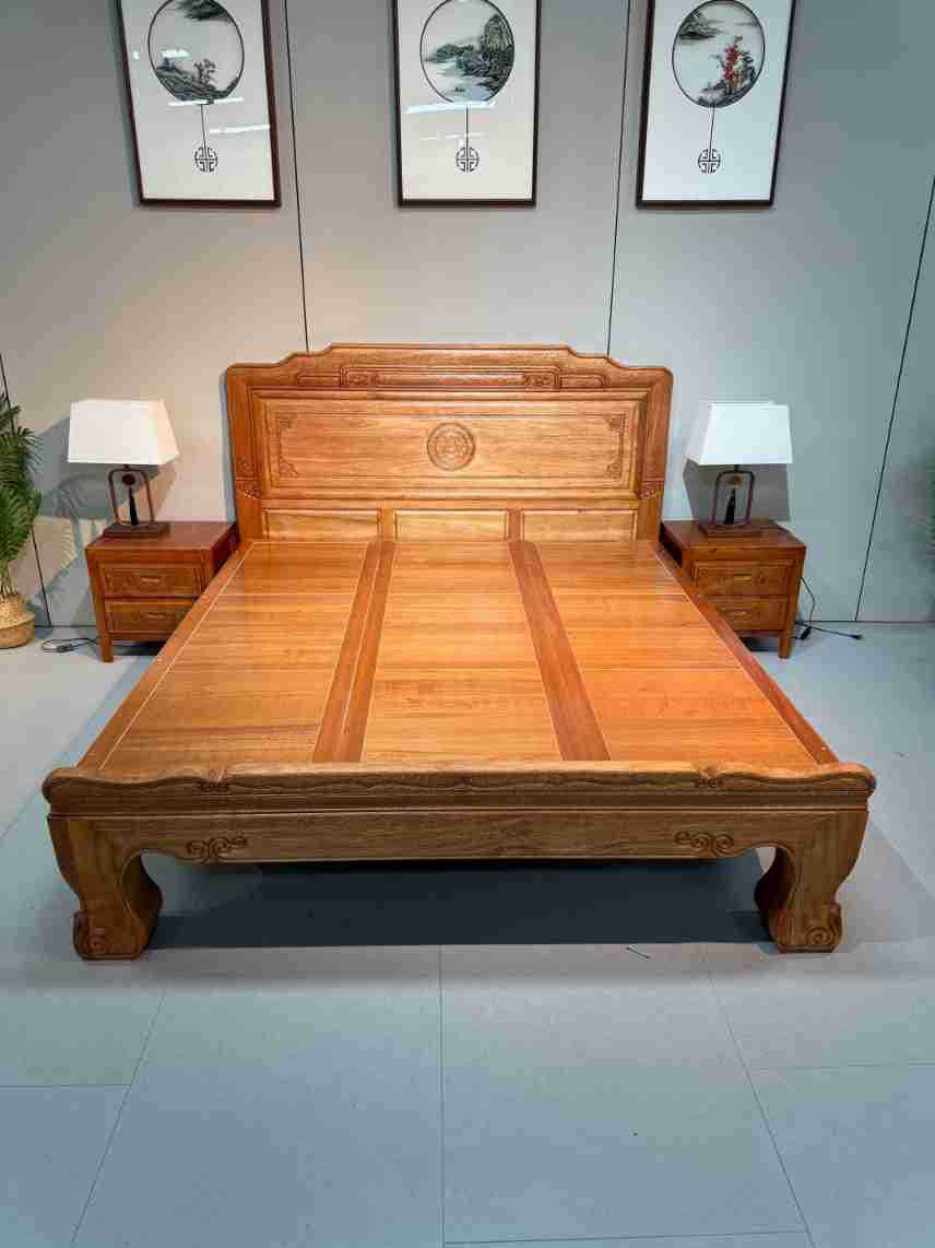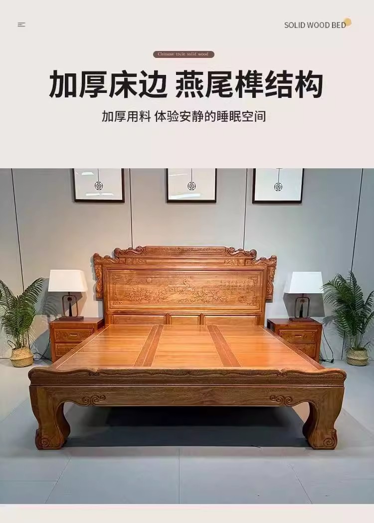 実木床ほぞ卯彫刻金花梨木全実木工芸ダブルベッド高級豪華紅木結婚ベッド