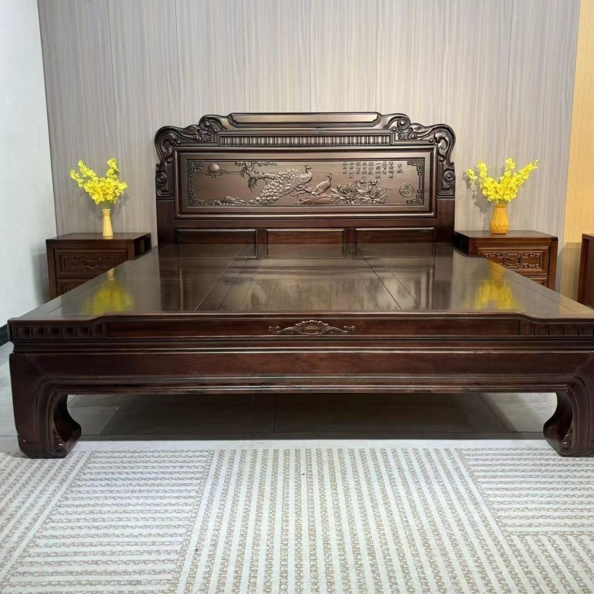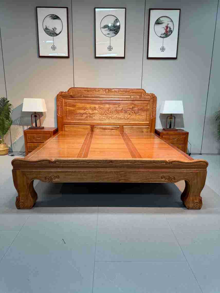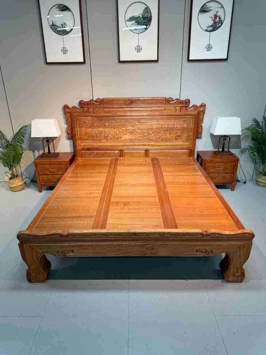 実木床ほぞ卯彫刻金花梨木全実木工芸ダブルベッド高級豪華紅木結婚ベッド