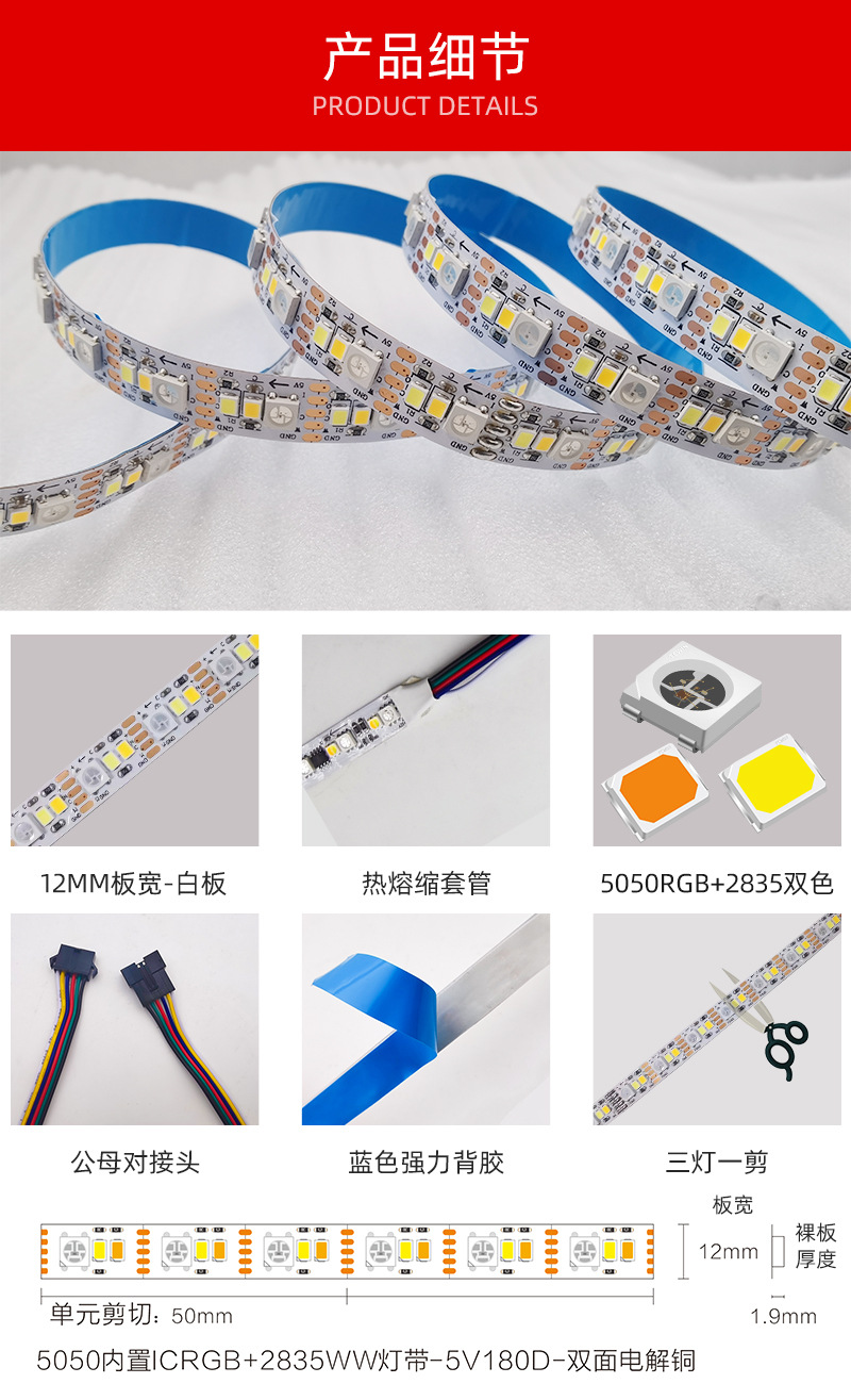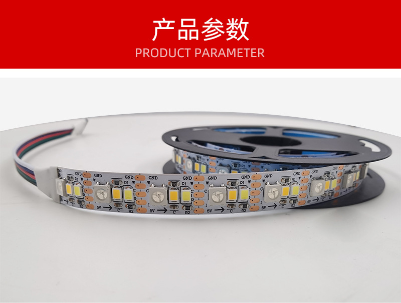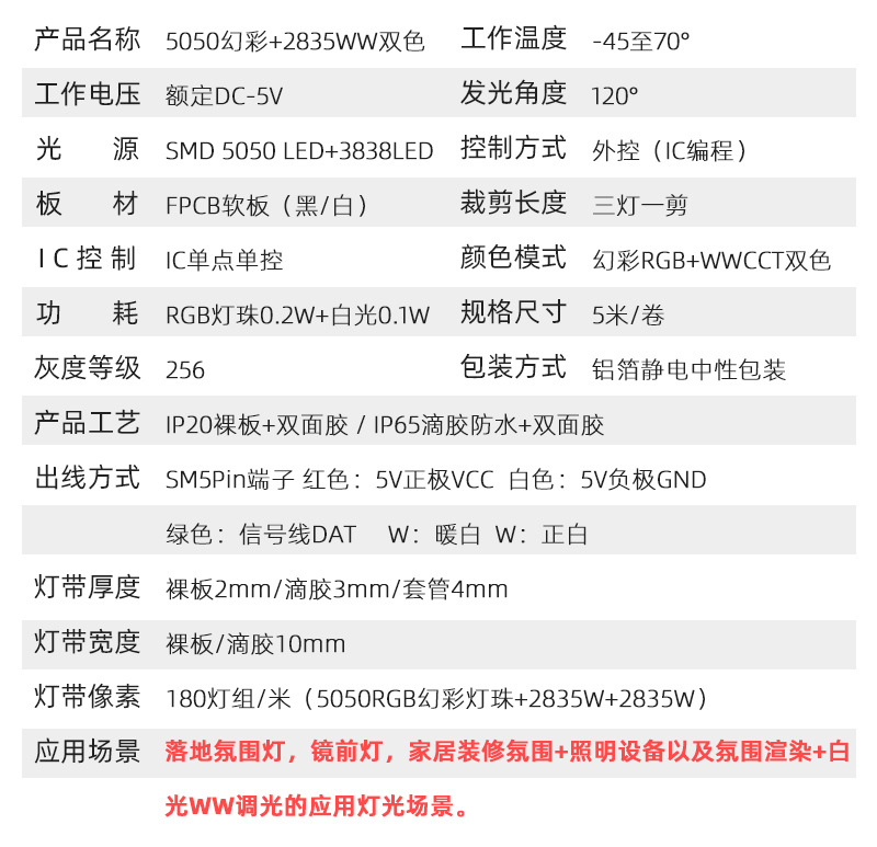 规格型号 5050RGB+2835W+2835W IP20裸板;白色PCB;RGB+CCT;5V;5米/卷 12mm板宽;SPI+PWM(遥控+APP),5050RGB+2835W+2835W IP65滴胶;白色PCB;RGB+CCT;5V;5米/卷 12mm板宽;SPI+PWM(遥控+APP)