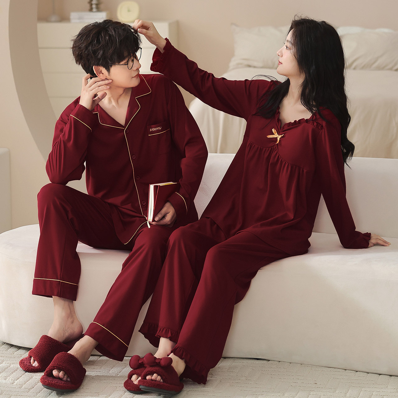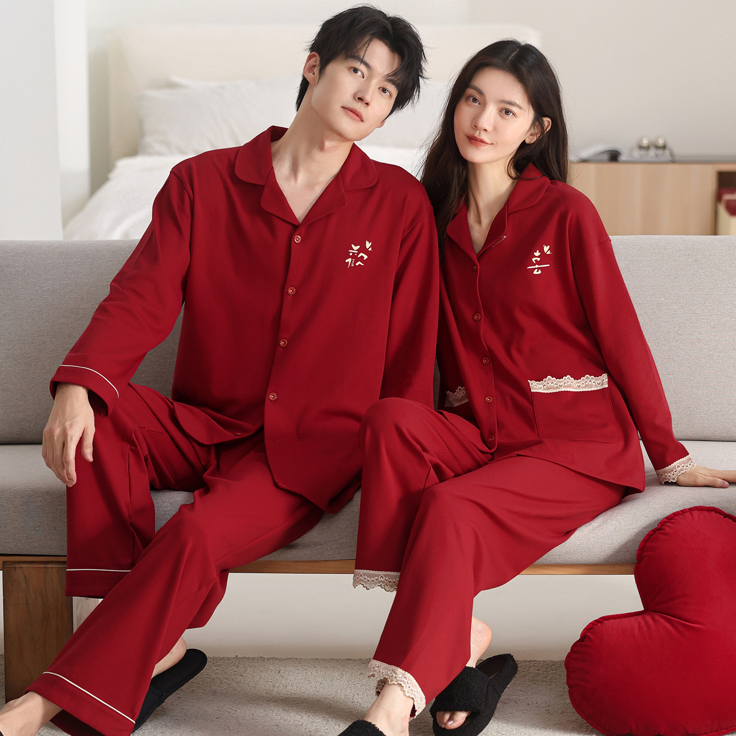 拉架爽棉情侣睡衣女男士春秋款长袖红色新婚可外穿夫妻家居服套装