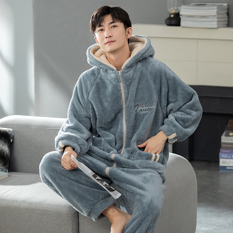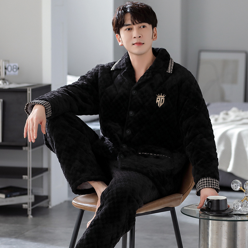 秋冬三層綿を挟んだパジャマ男性用冬にベルベットを厚くしたサンゴのベルベット男性の家庭服冬の綿服セット