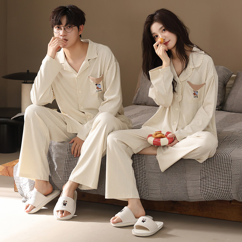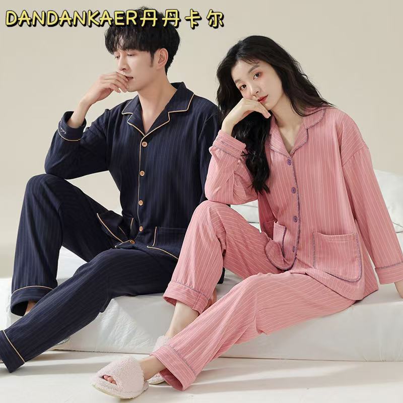 棉拉架春秋季情侣睡衣长袖一男一女新款翻领开衫纯棉家居服套装