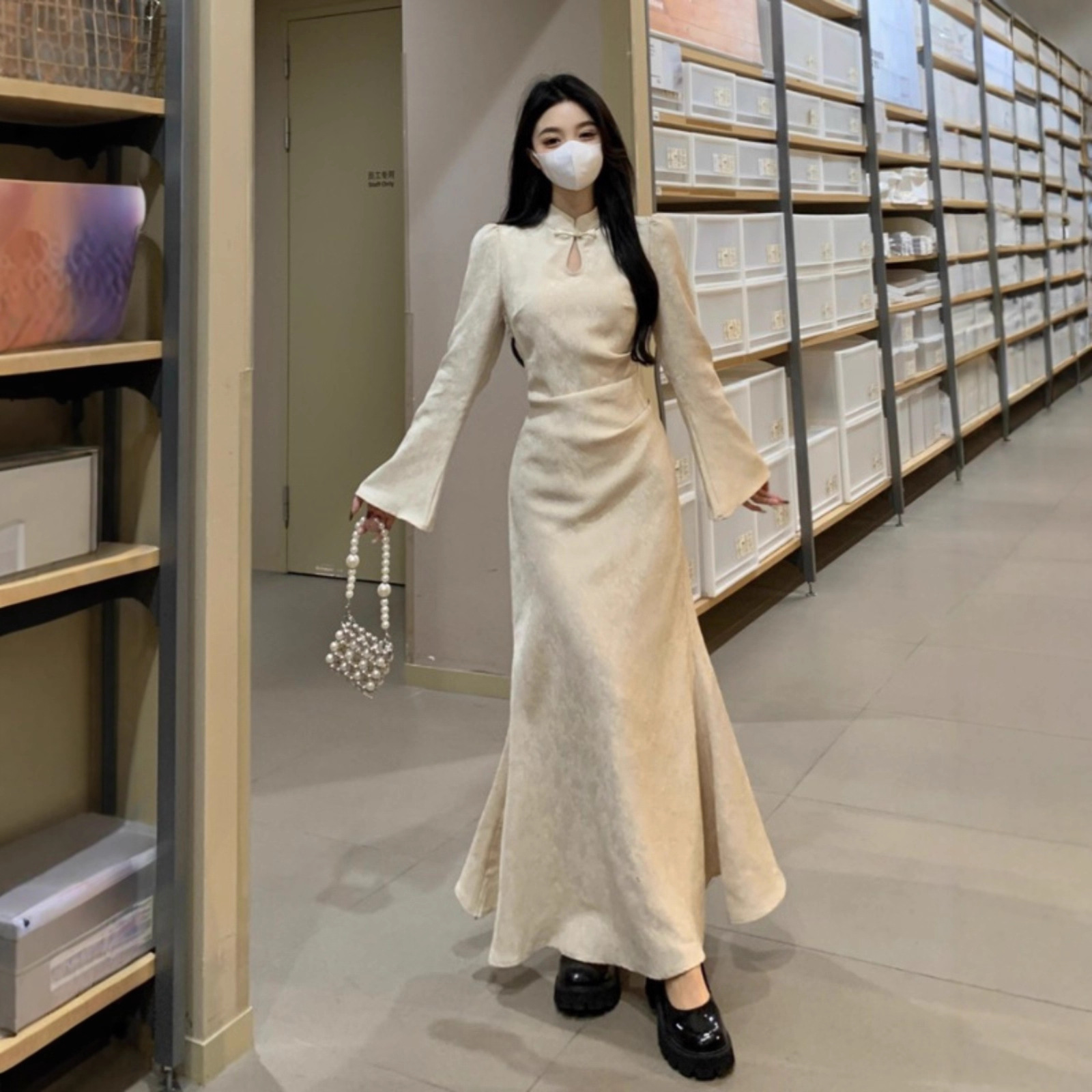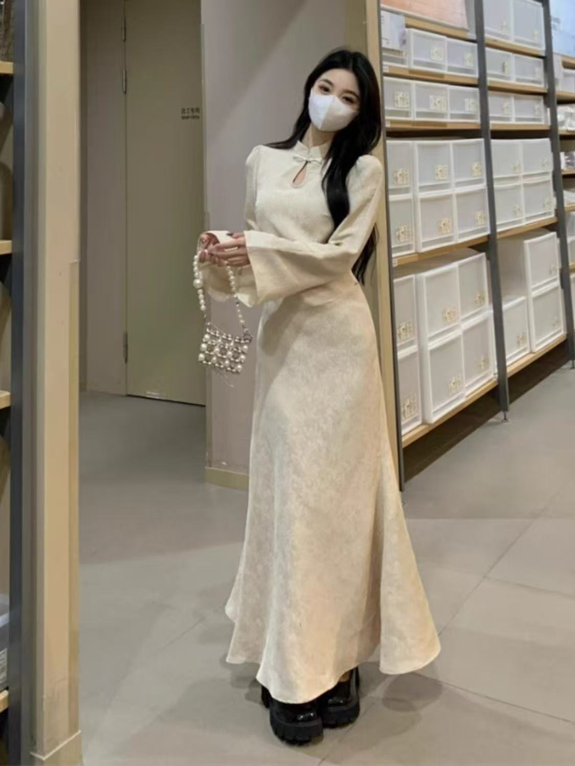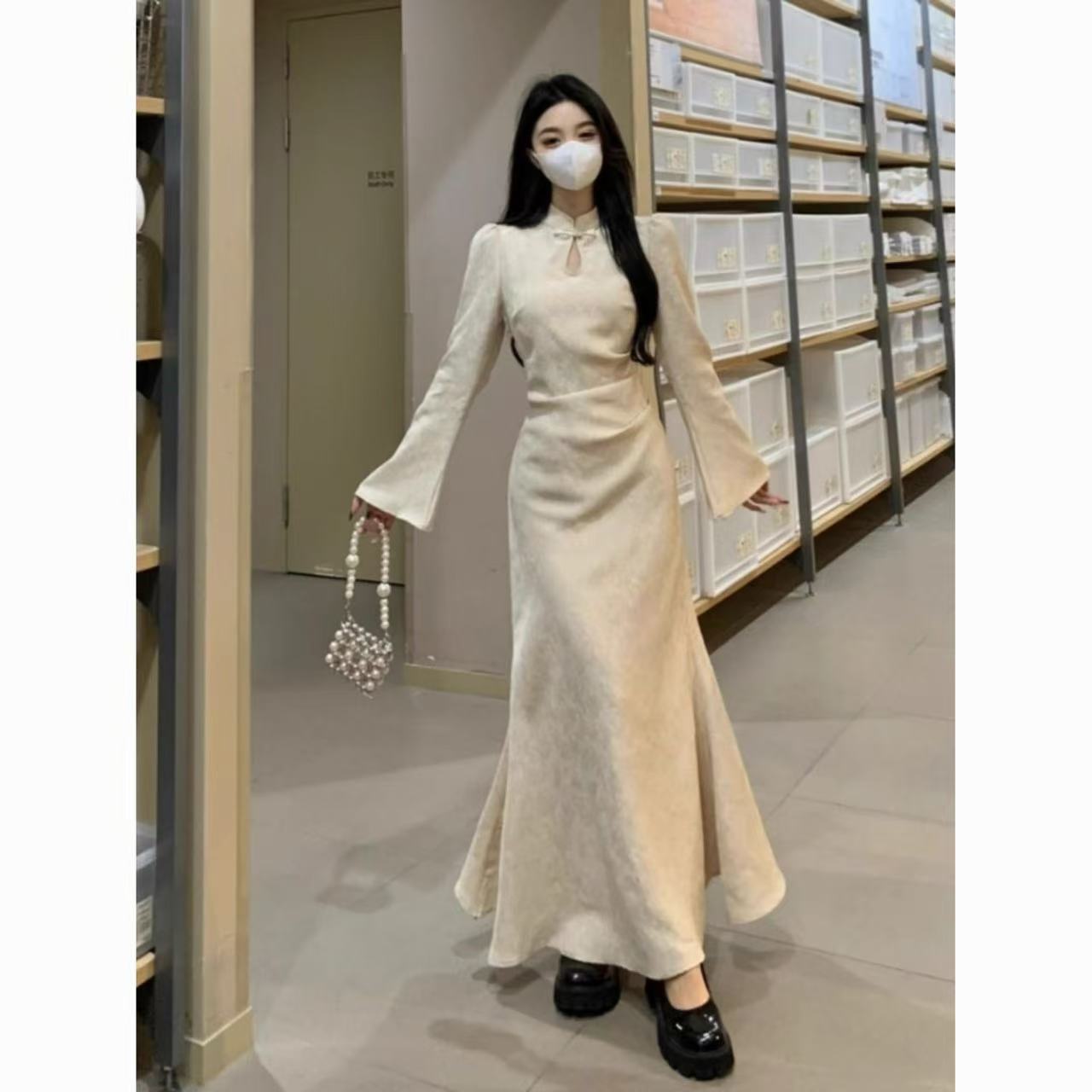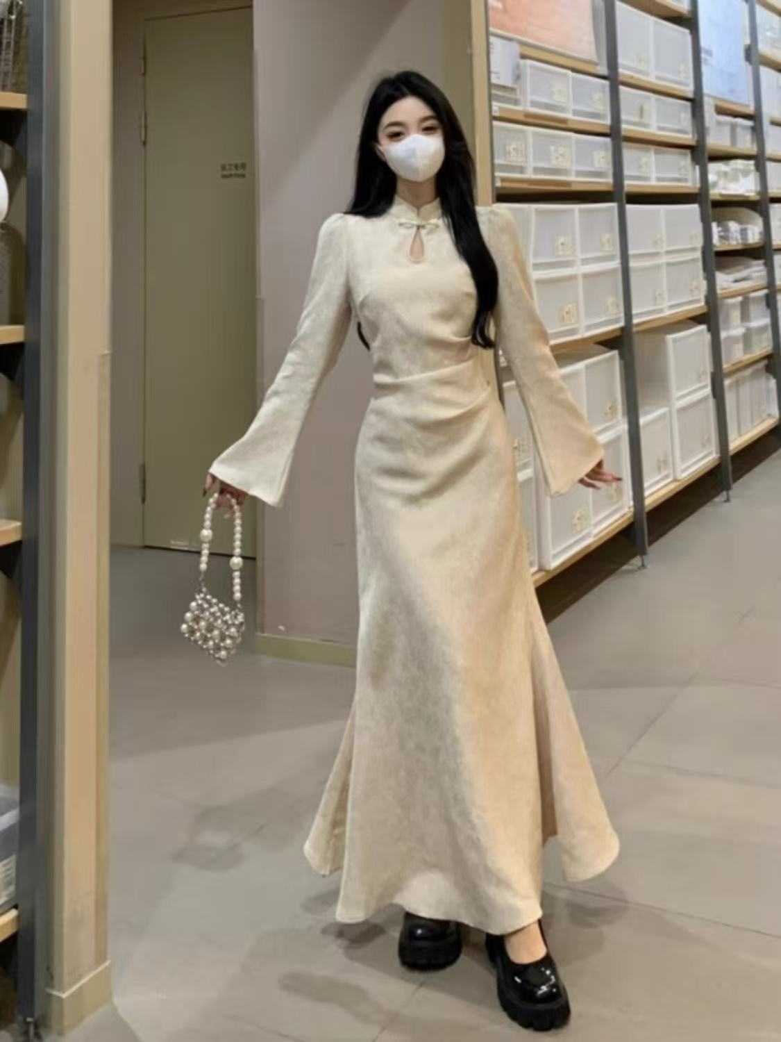 大码法式高级旗袍连衣裙中式秋冬改良赫本米杏色裙收腰坠感裙子