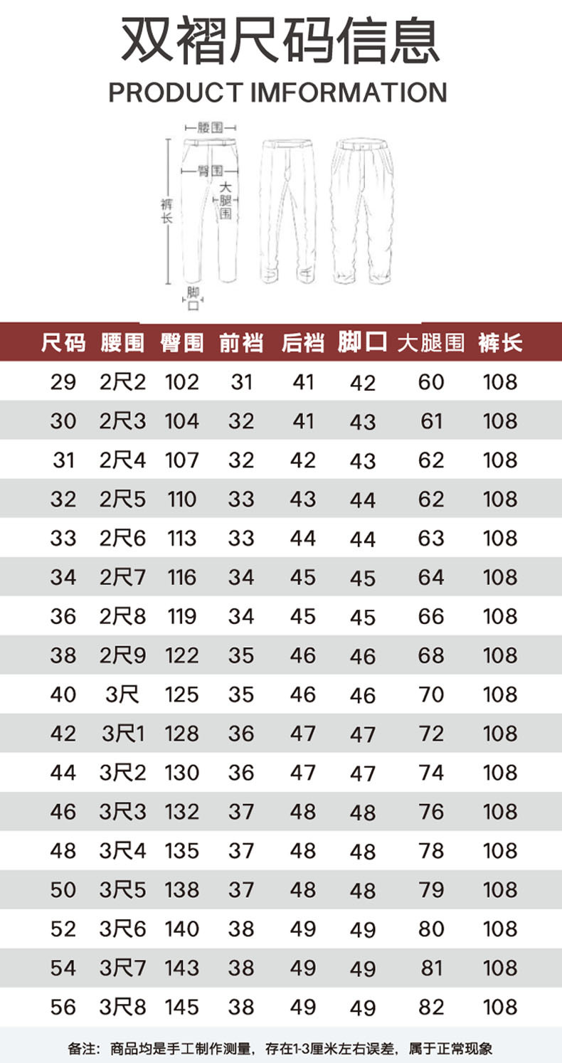 尺码 29(2尺2),30(2尺3),31(2尺4),32(2尺5),33(2尺6),34(2尺7),36(2尺8),38(2尺9),40(3尺),42(3尺1),44(3尺2),大码46(3尺3),大码48(3尺4),大码50(3尺5),大码52(3尺6),大码54(3尺7),大码56(3尺8)