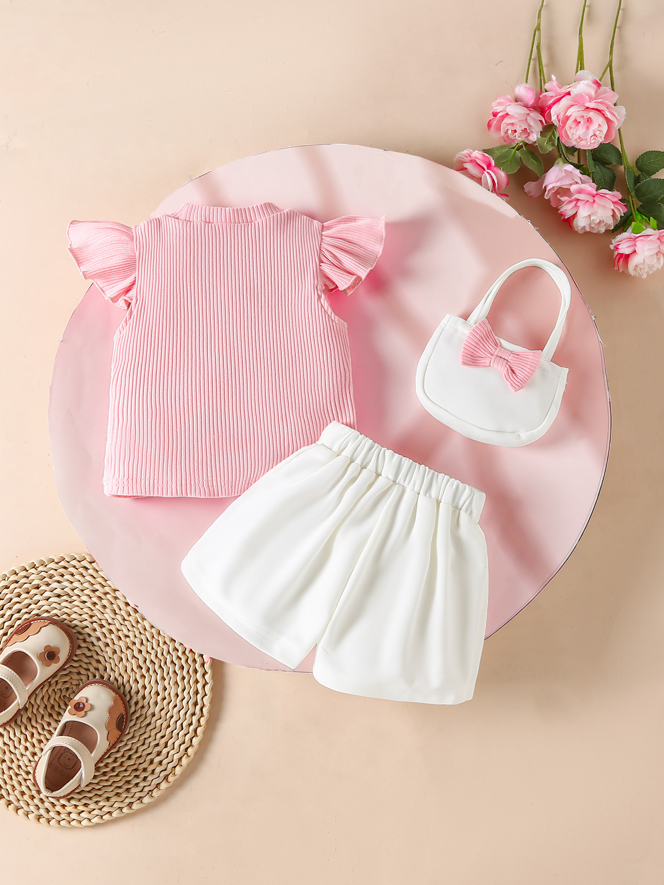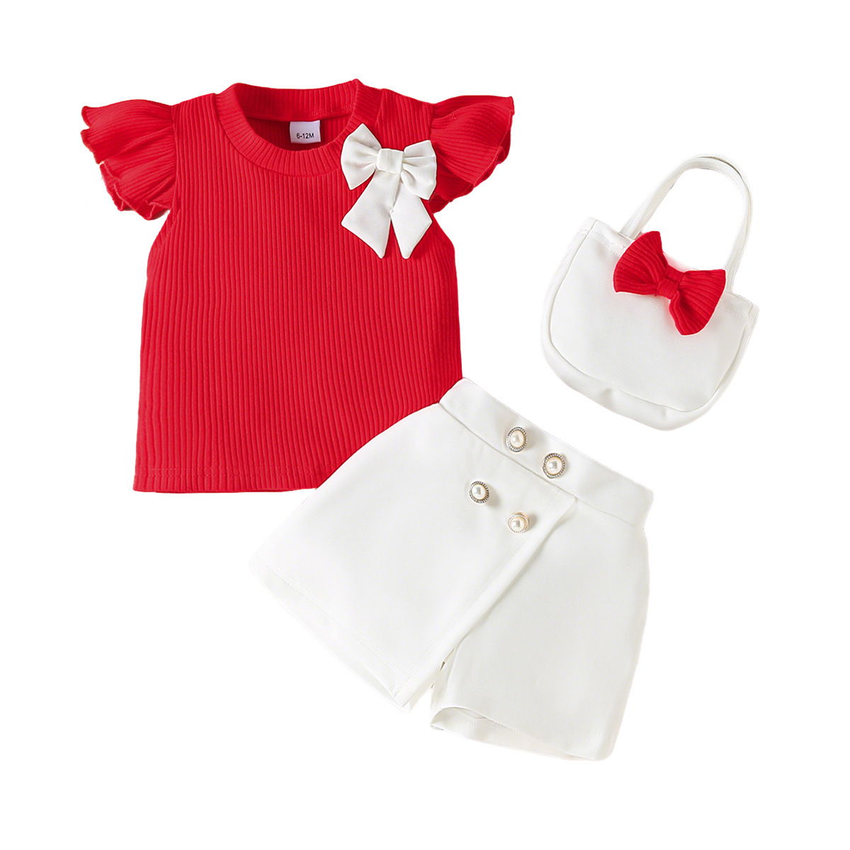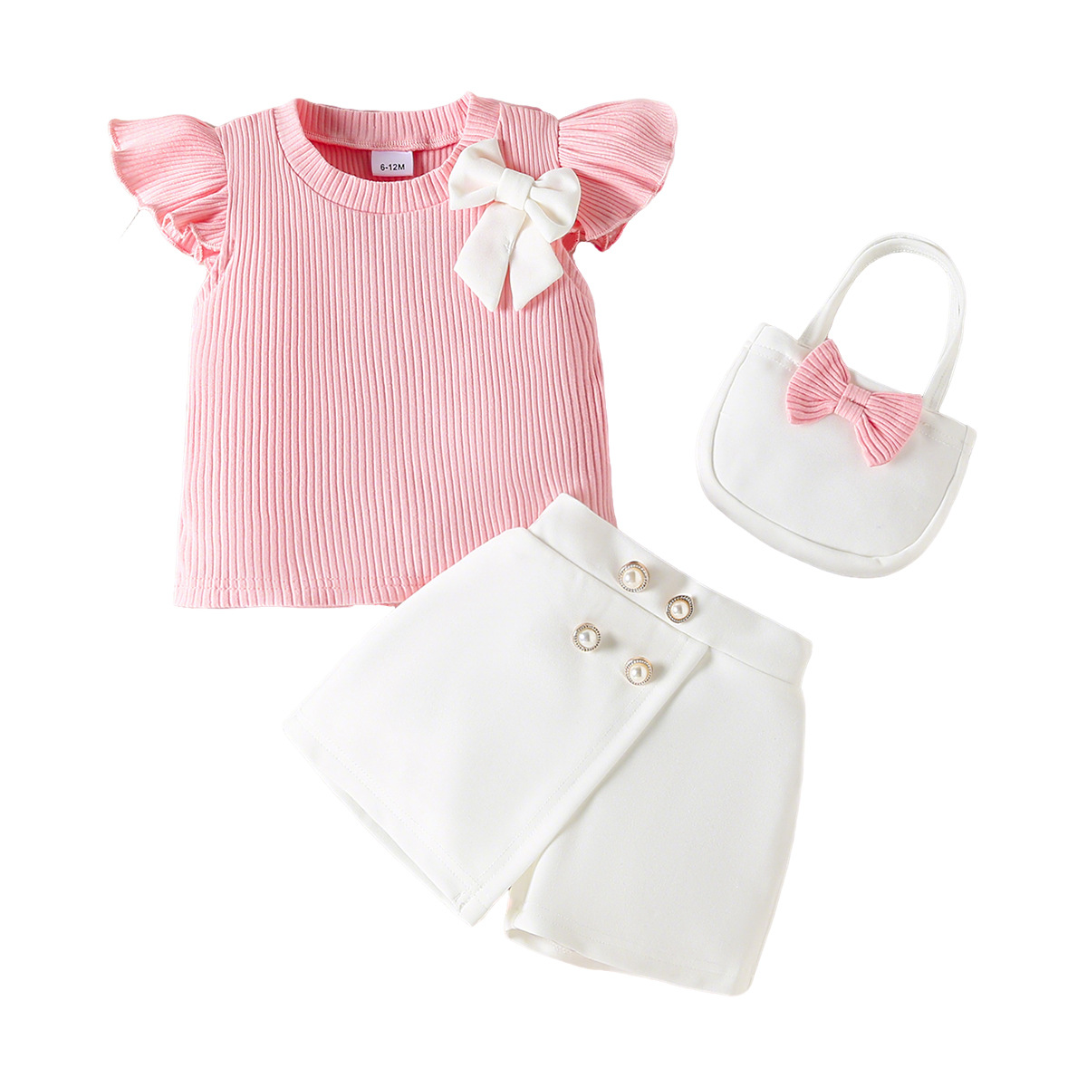 跨境2026年新款春夏季女童套装蝴蝶结纯色短袖上衣短裤包包三件套