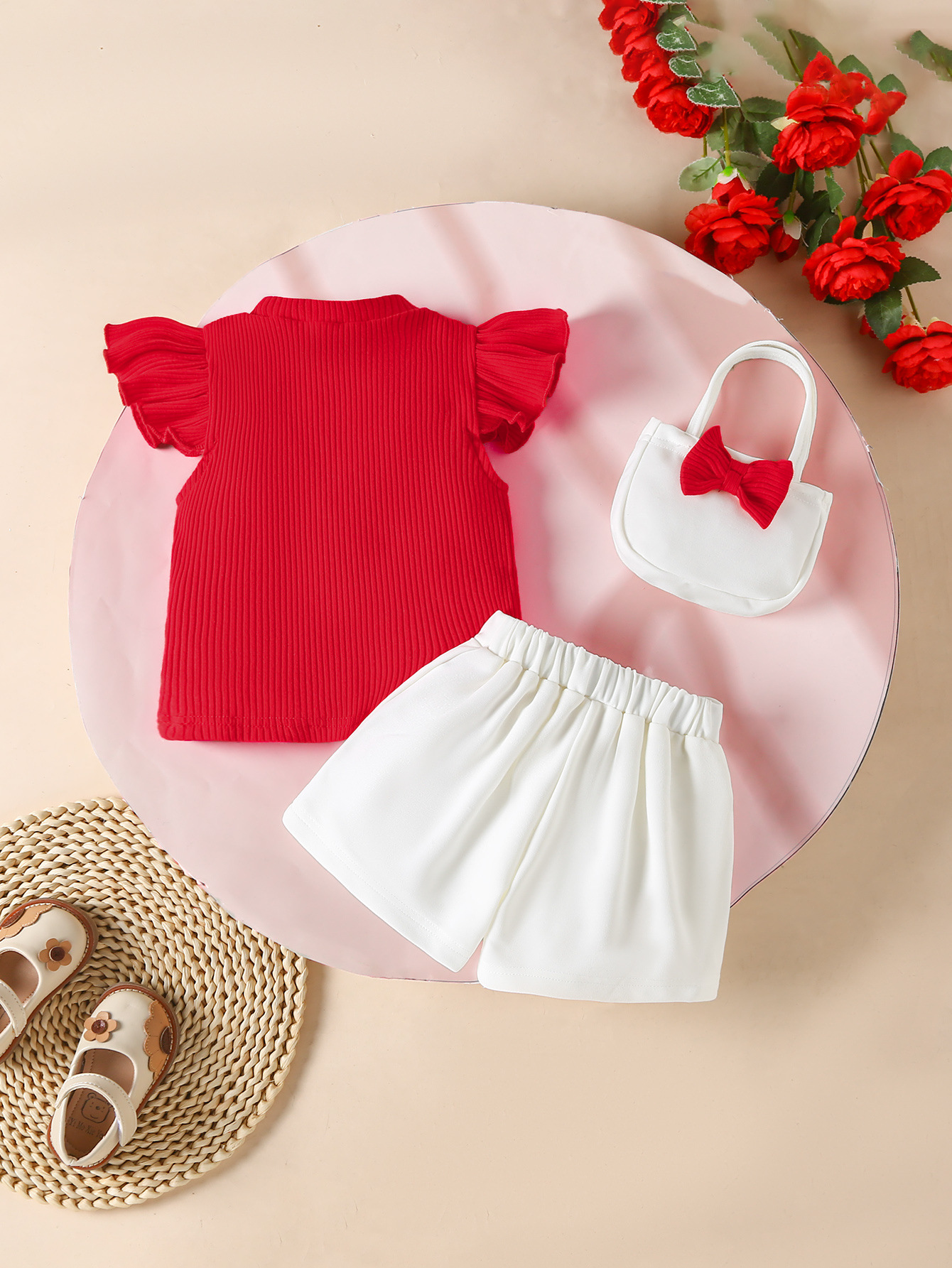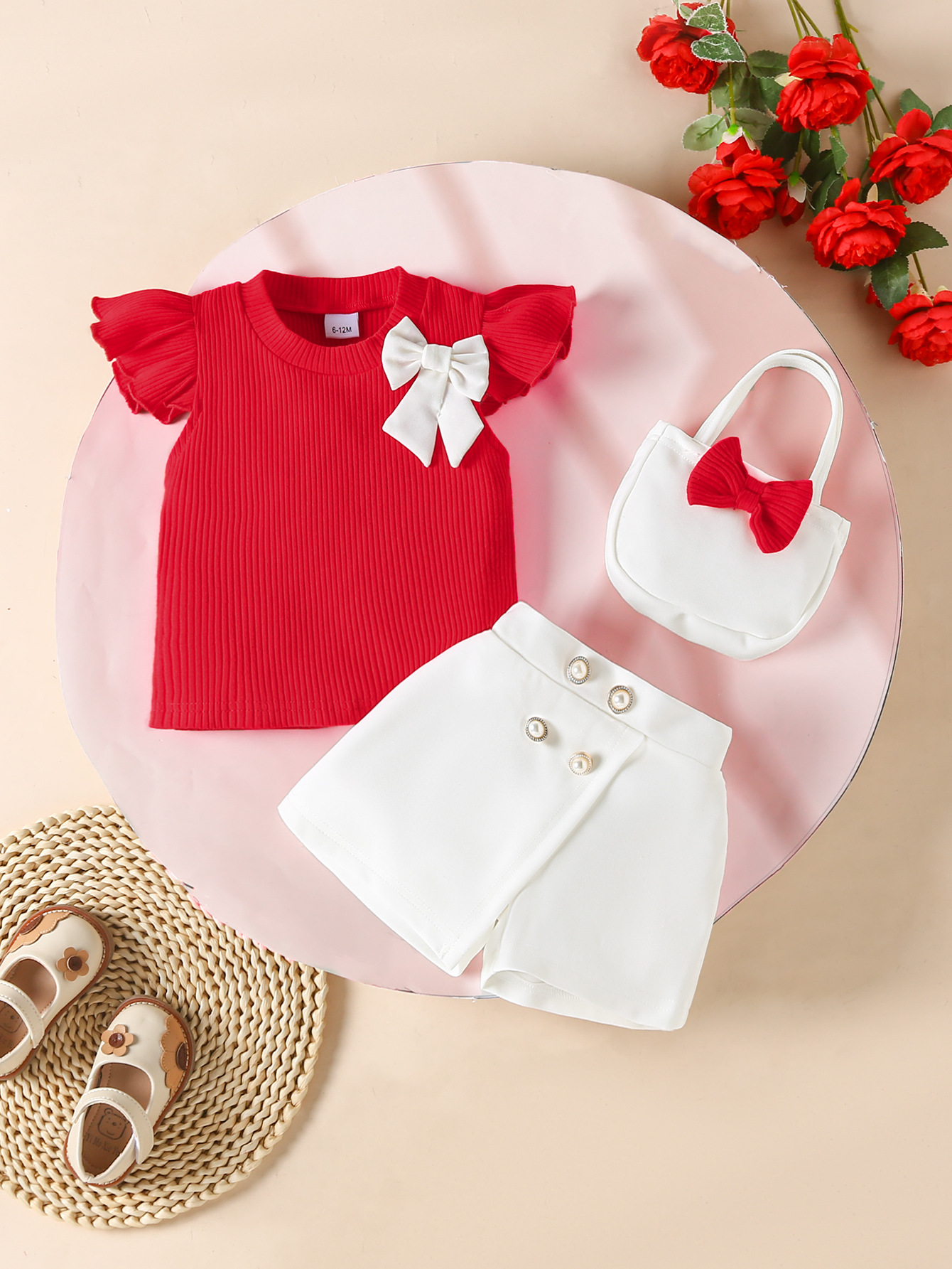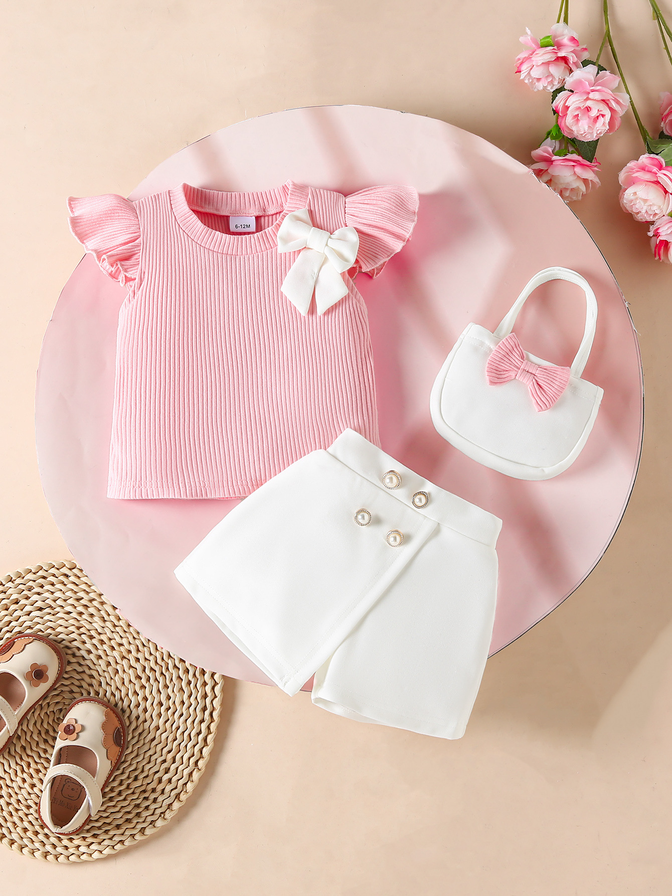 跨境2026年新款春夏季女童套装蝴蝶结纯色短袖上衣短裤包包三件套