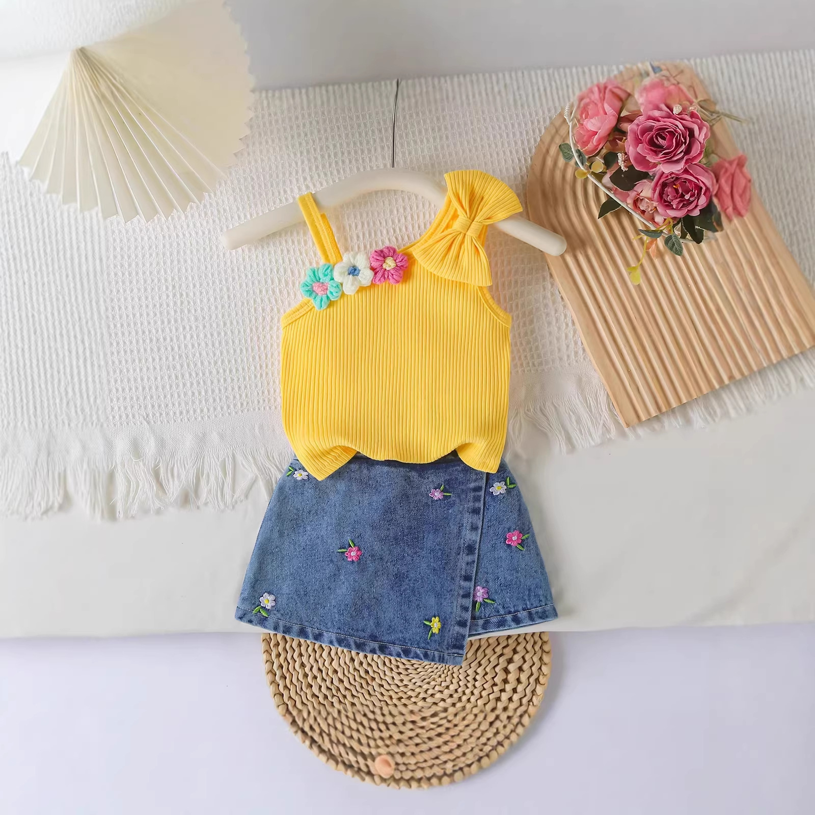 2026跨境新款女童套装 立体花针织吊带上衣+牛仔刺绣短裙两件套