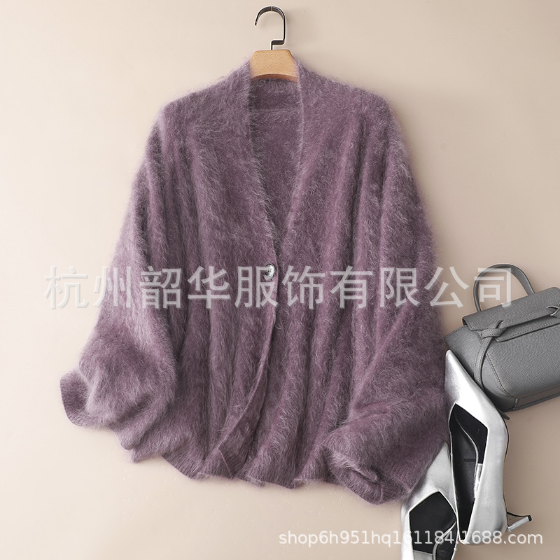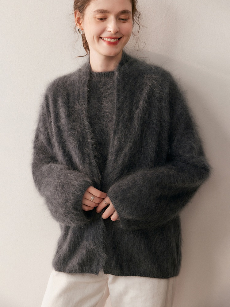 新款山羊羊毛绒开衫女气质灰针织秋冬披肩宽松慵懒风毛衣外套跨境