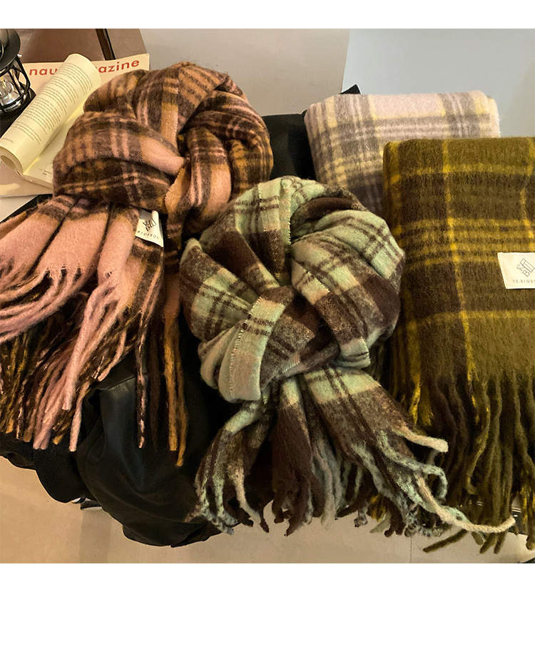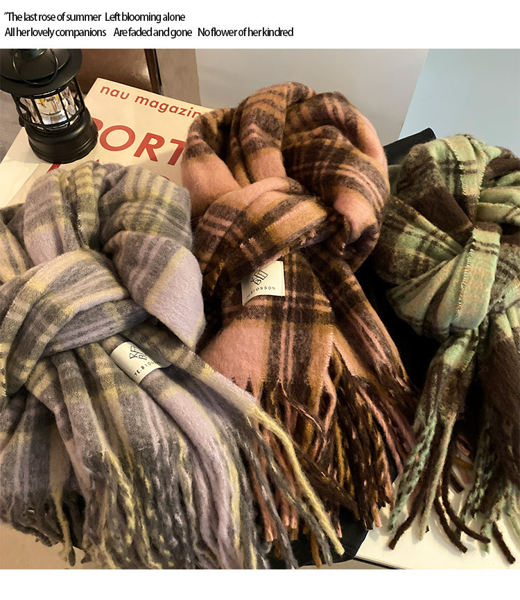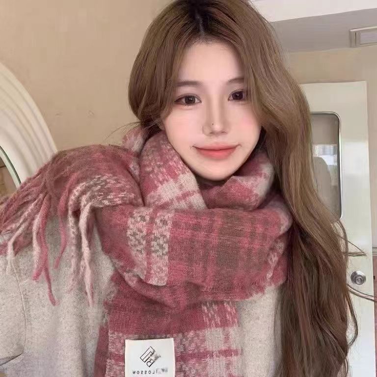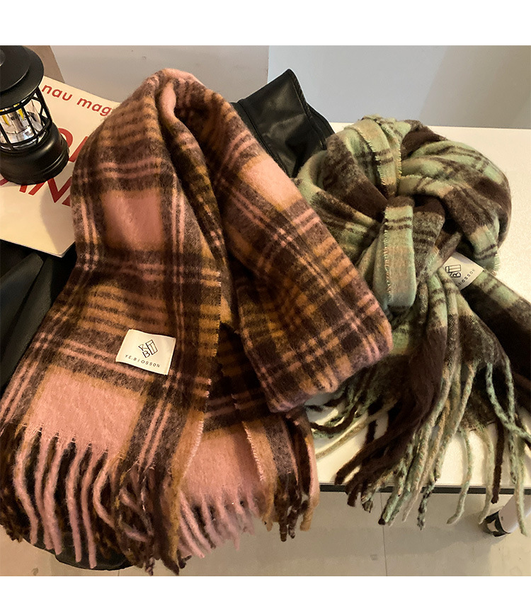 格子のマフラーの女性の韓系の雰囲気感の保温の新商品の乾いたバラの粉の秋冬は白い柔らかいフリンジストールのマフラーを現します。