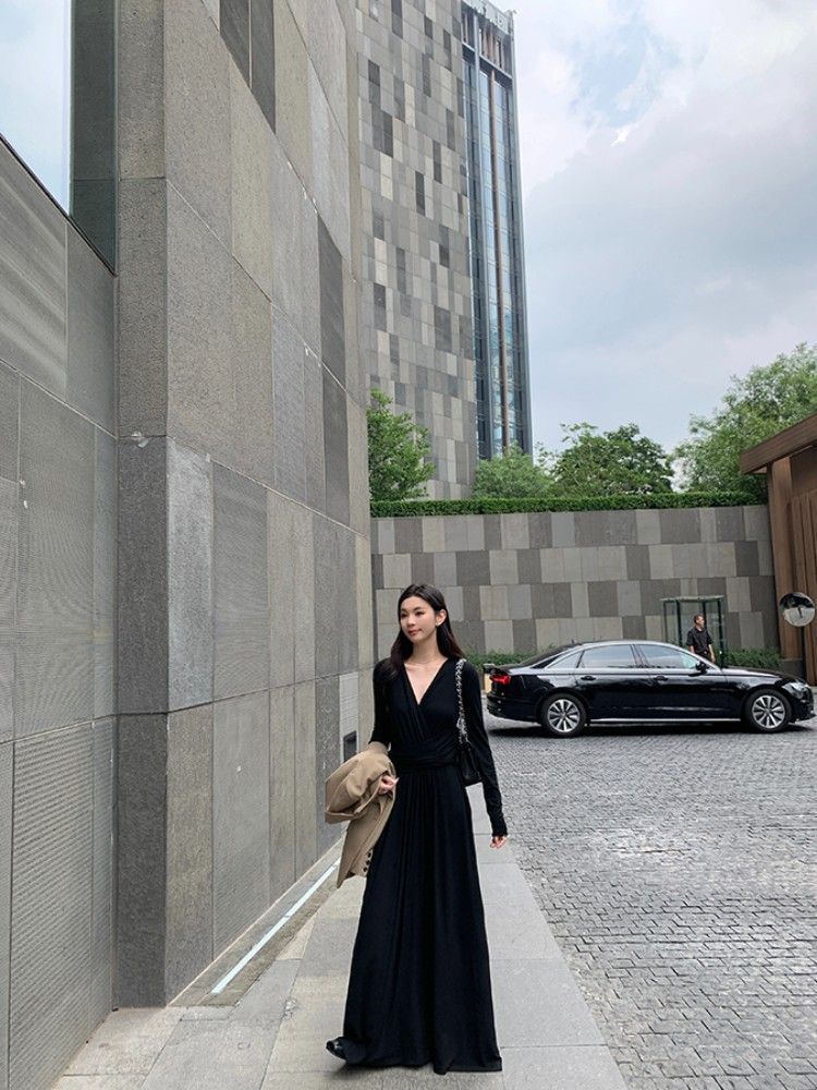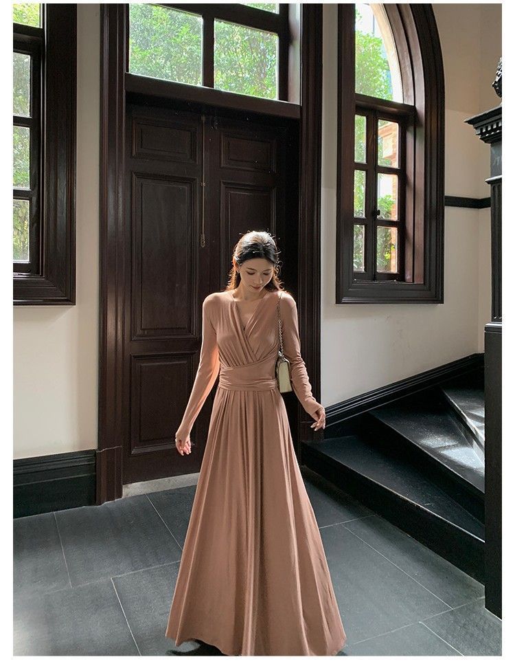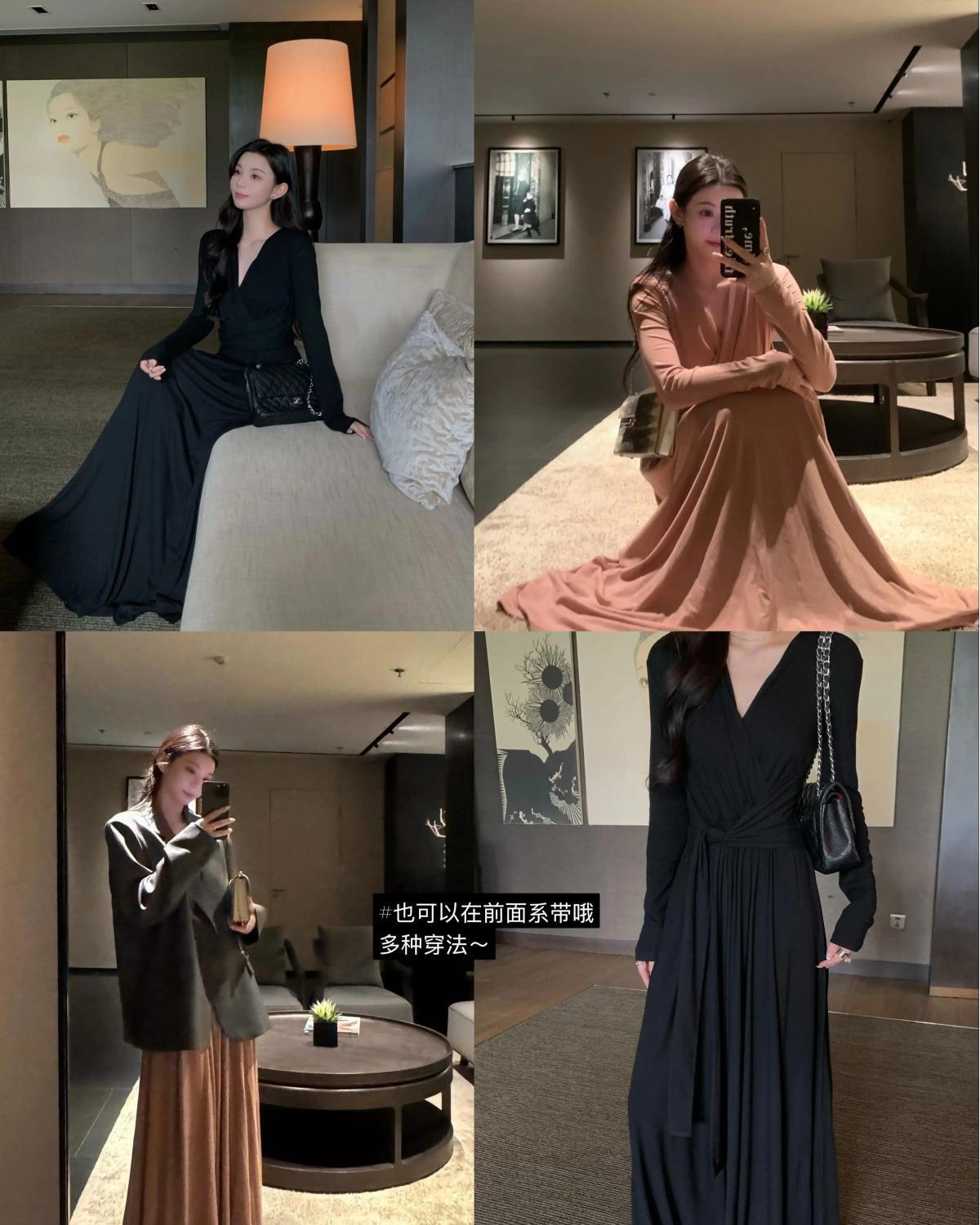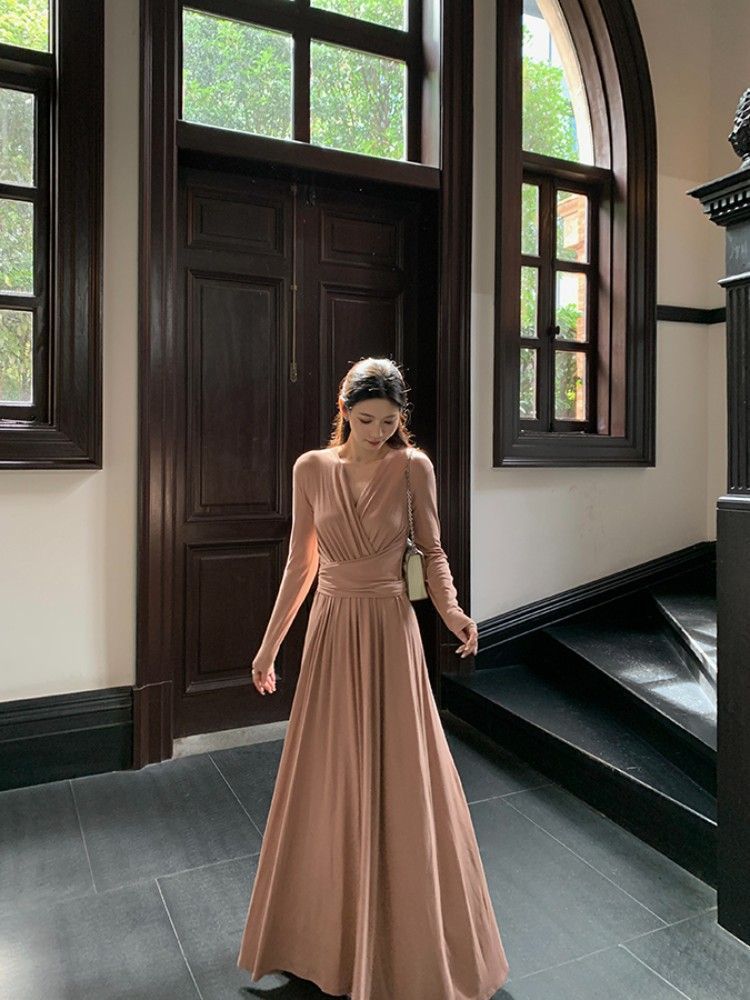 简约百搭v领收腰显瘦连衣裙女秋冬季气质绑带垂感显瘦A字大摆长裙