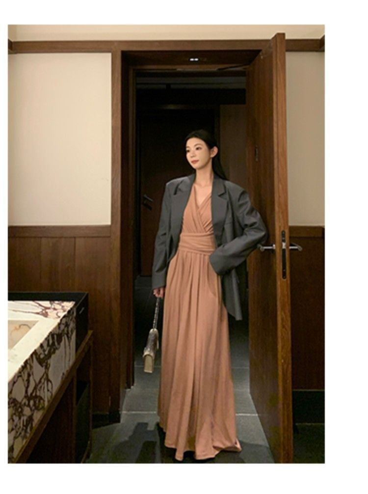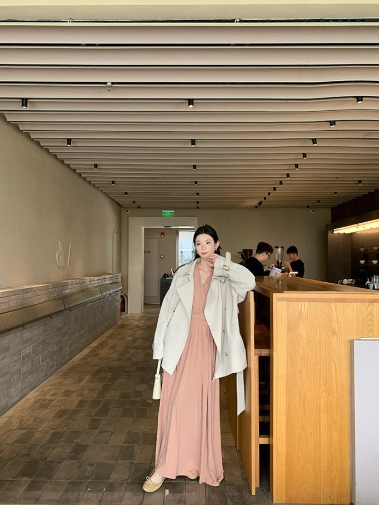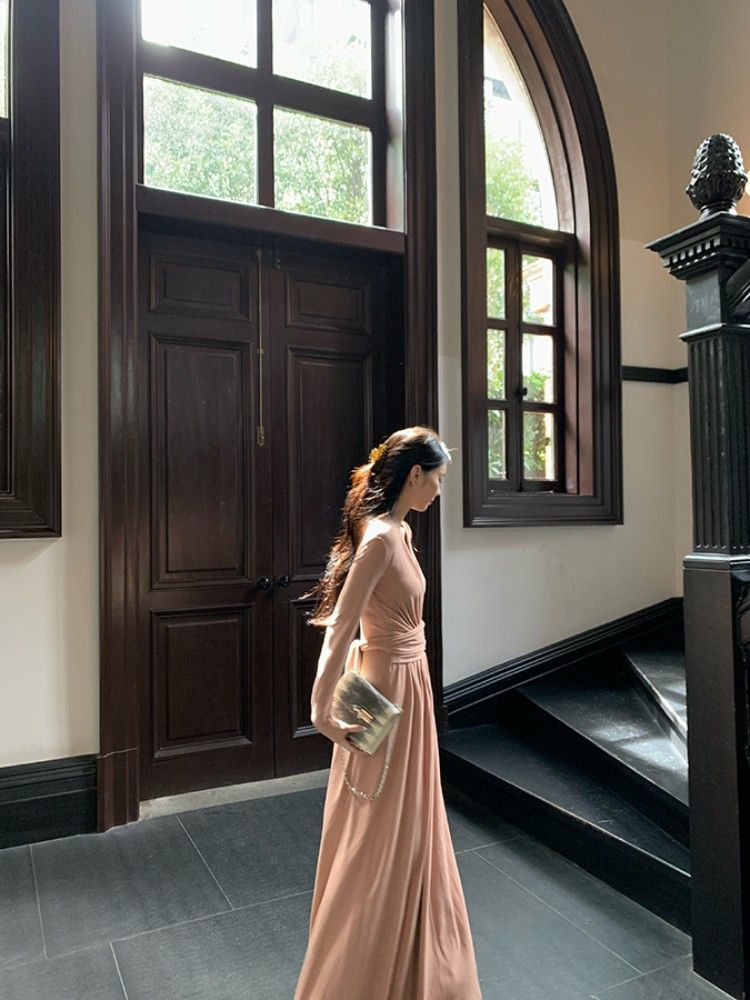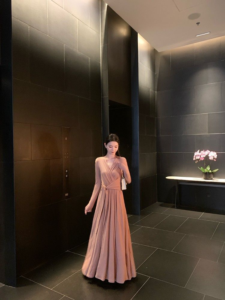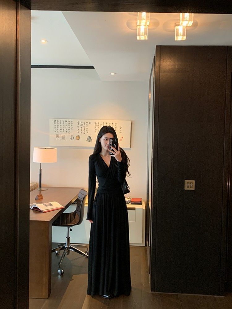 简约百搭v领收腰显瘦连衣裙女秋冬季气质绑带垂感显瘦A字大摆长裙