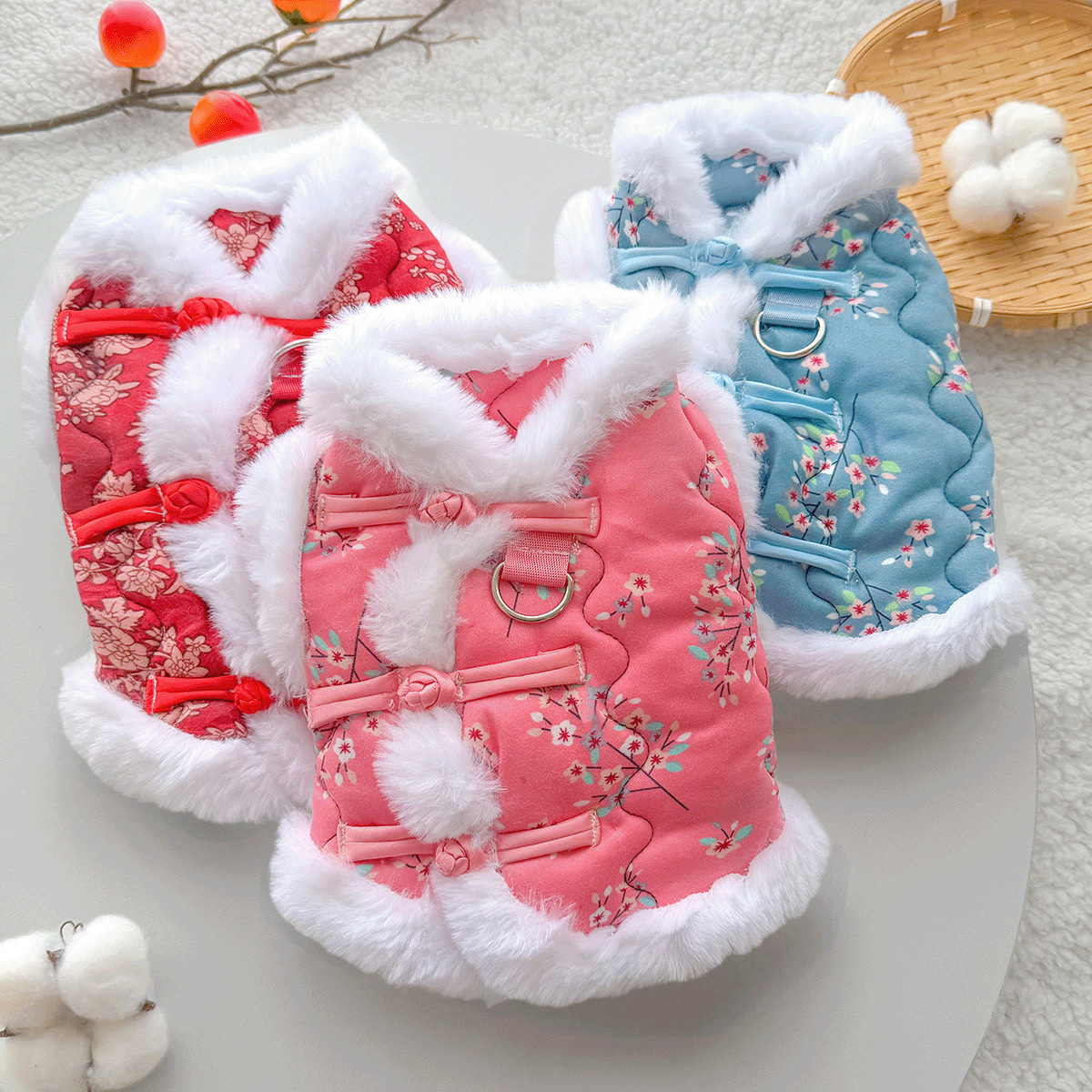 新年風冬服、中国風刺繍入りチャイナドレス、新中式、裏起毛で暖かいペット用秋冬服、犬猫用唐装