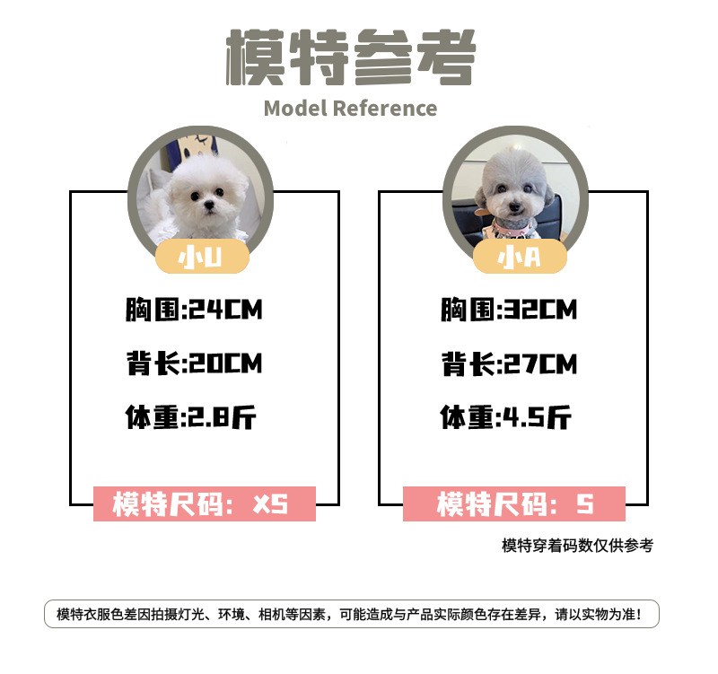 尺码 XS-胸28背16【建议3斤内】,S-胸33背21【建议3-5斤】,M-胸38背26【建议5-7斤】,L-胸43背31【建议7-10斤】,XL-胸48背36【建议10-13斤】,XXL-胸53背41【建议13-16斤】