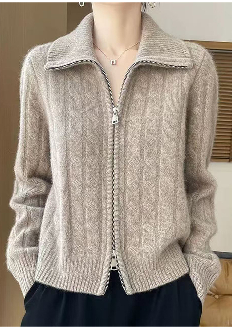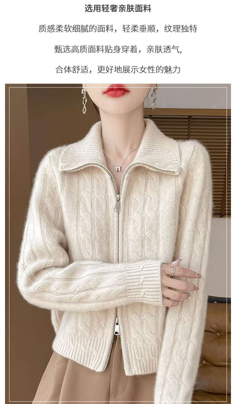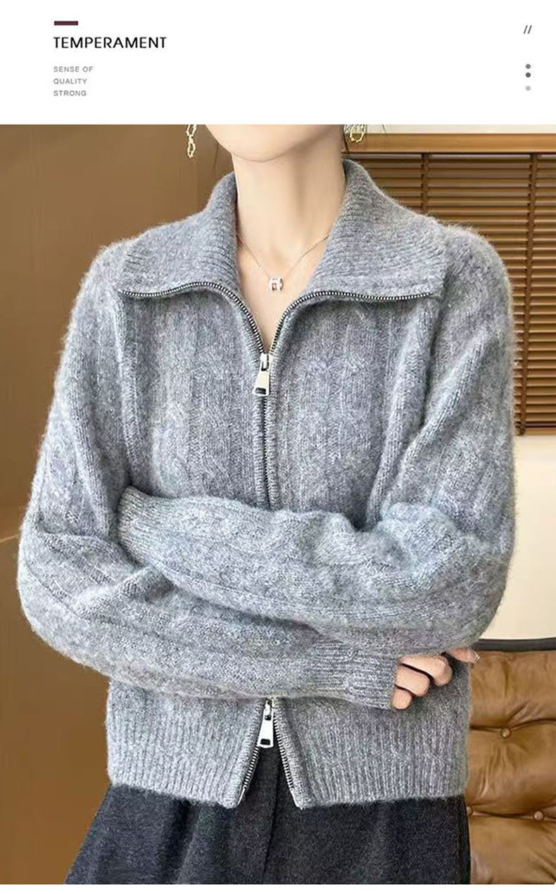 双拉链翻领扭花开衫女软糯加厚麻花毛衣女士新款2025针织外套上衣