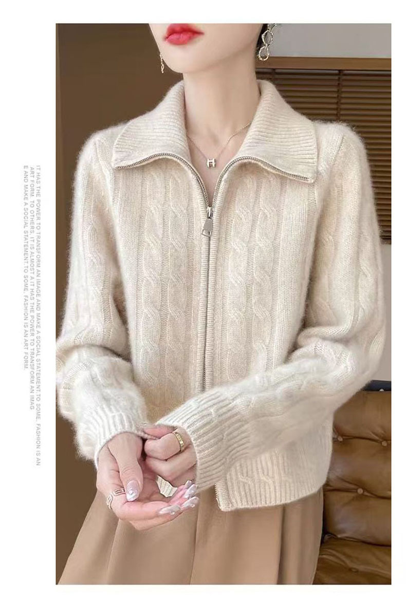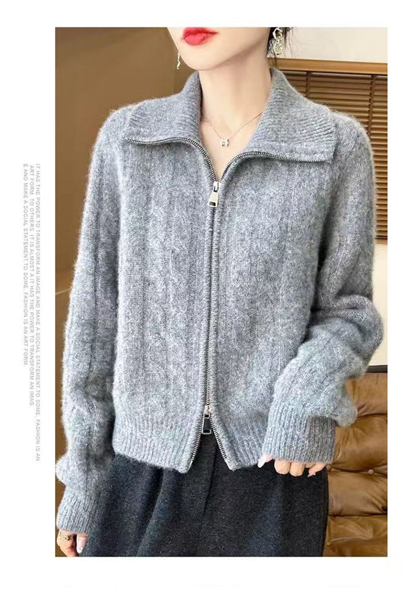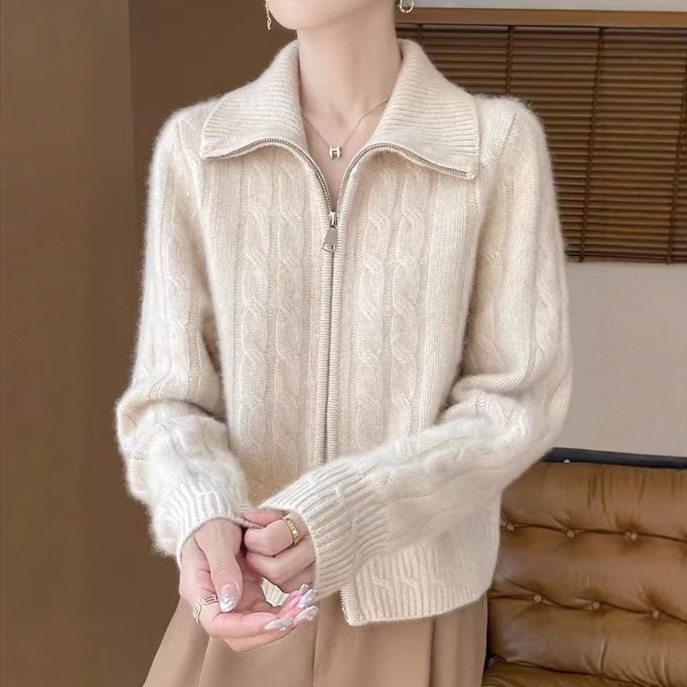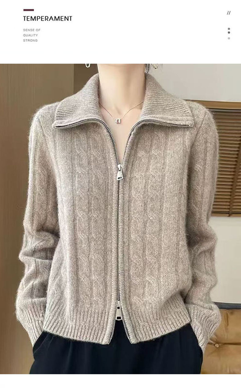 双拉链翻领扭花开衫女软糯加厚麻花毛衣女士新款2025针织外套上衣