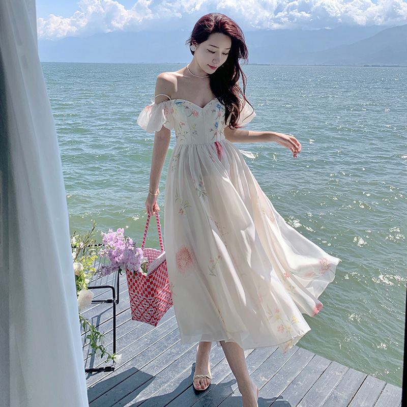 高级感パーティードレスドレスワンピースレディース夏フレンチ斜め襟肩プルオーバー袖ハイウエストオープンフォーク宴会ロングスカート
