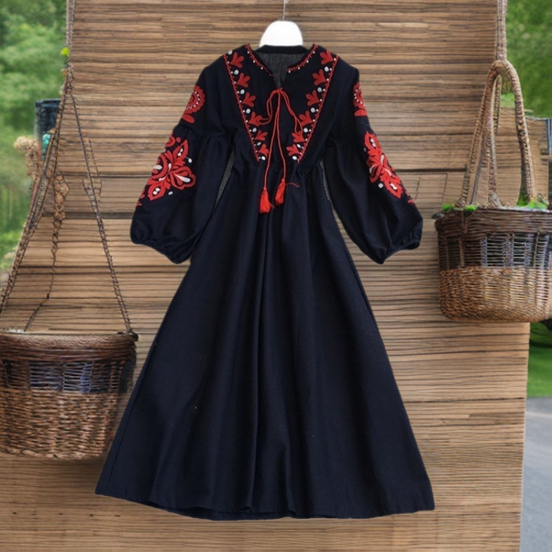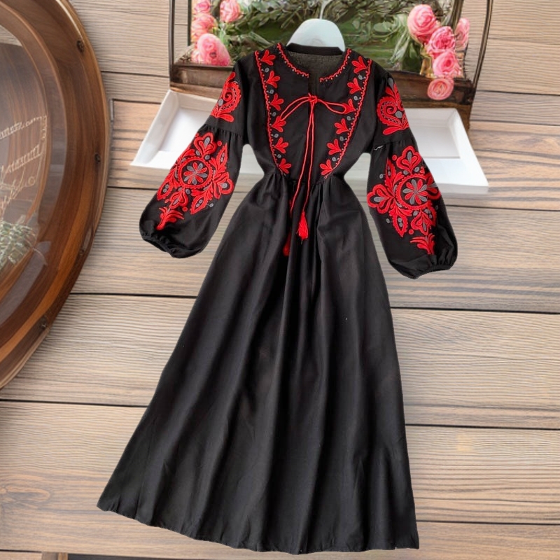 ボヘミアン民族風刺繍花丸首灯籠袖のしわを郵送します。