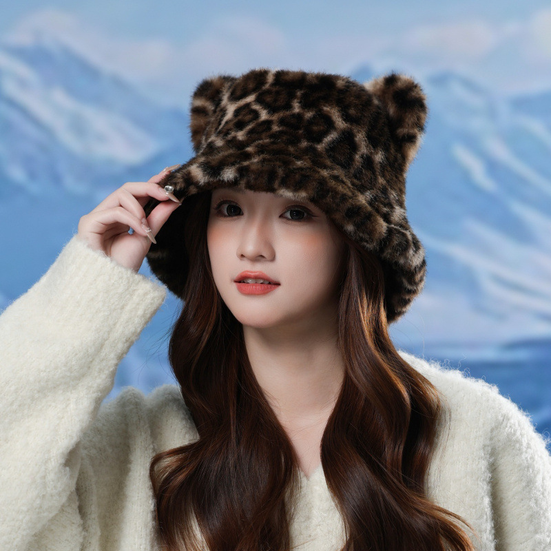 日韩系豹纹耳朵毛绒渔夫帽子秋冬户大头围显脸小户外加厚保暖盆帽