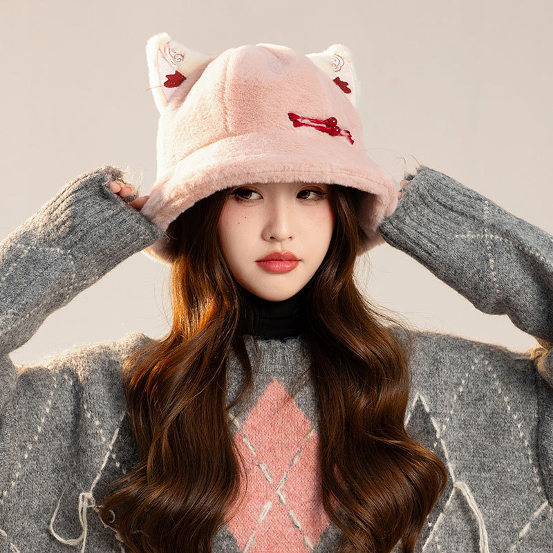 かわいい子猫のぬいぐるみの帽子の女性の秋の冬の保温とベルベットの顔のウサギの毛のバケツの国風漁師の帽子