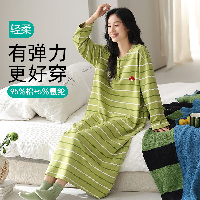 A类抗菌纯棉睡裙女士秋冬季长袖连衣裙女加大码全棉睡衣家居服女