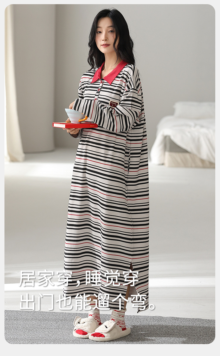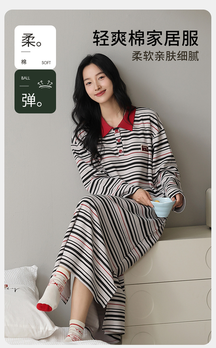 拉架棉带胸垫长袖睡裙女款秋冬季中长款可外穿休闲宽松纯棉家居服