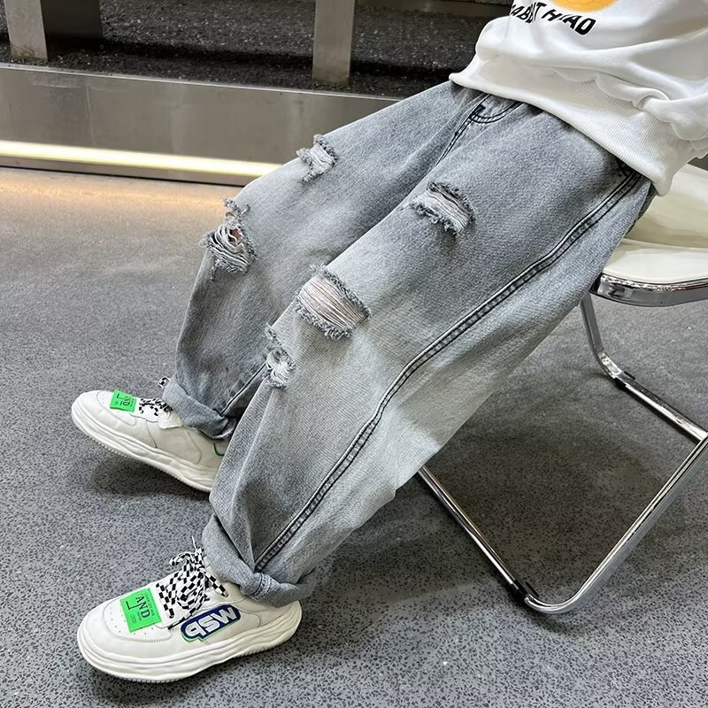 子供服の男の子の穴が開いているジーパンの春秋のズボン2025春の新型の子供のズボンの洋風が街の春の服を揚げます。
