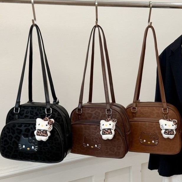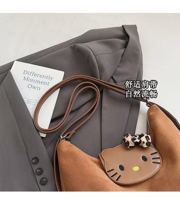 韩版复古豹纹kitty猫单肩斜挎包女小众设计美拉德百搭通勤手提包