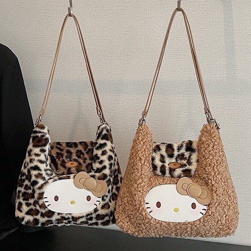 韩版复古豹纹凯蒂猫单肩斜挎包女毛绒卡通可爱手提包休闲百搭背包