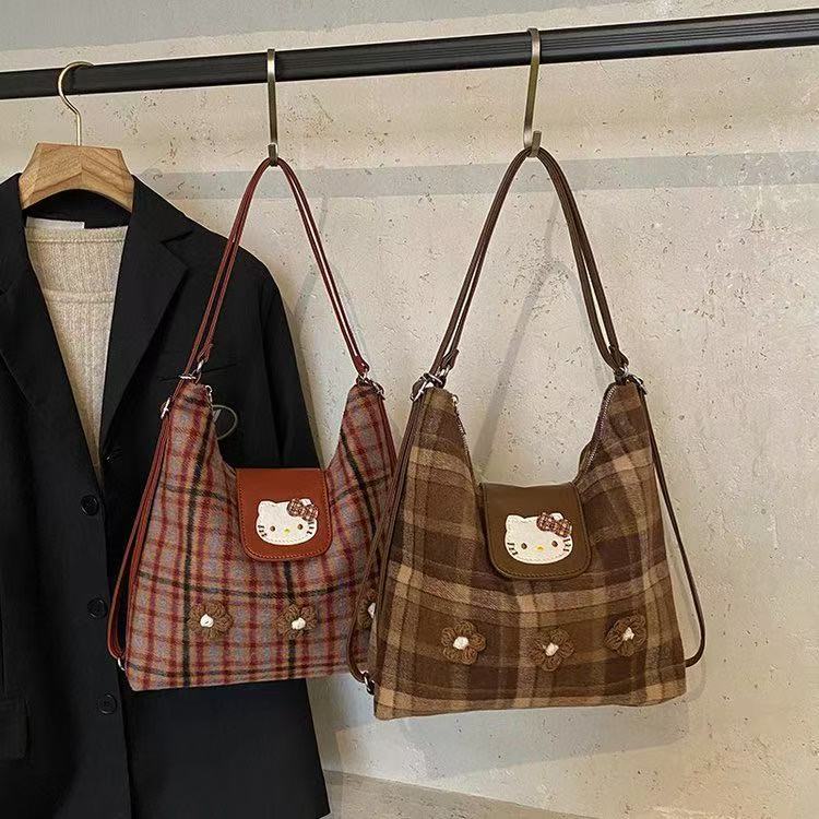 韓国風レトロカラフルチェック柄キティちゃんショルダーバッグ、女性用ニッチデザイン、漫画風で可愛い万能ハンドバッグ