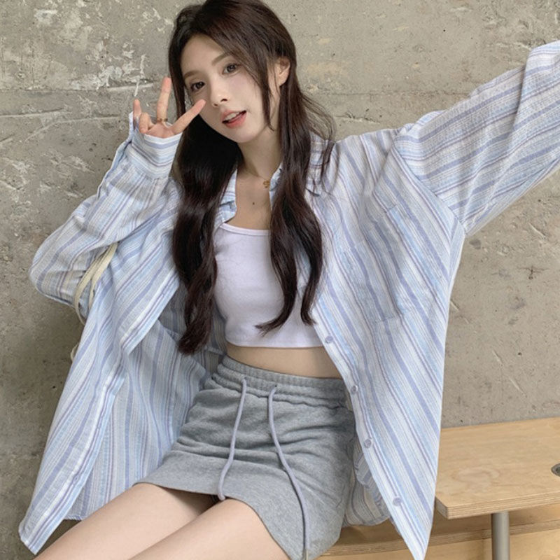 ブルーストライプ日焼け止めシャツ薄いシャツアウターレディース夏ルーズレイジー長袖カーディガンジャケットトップ