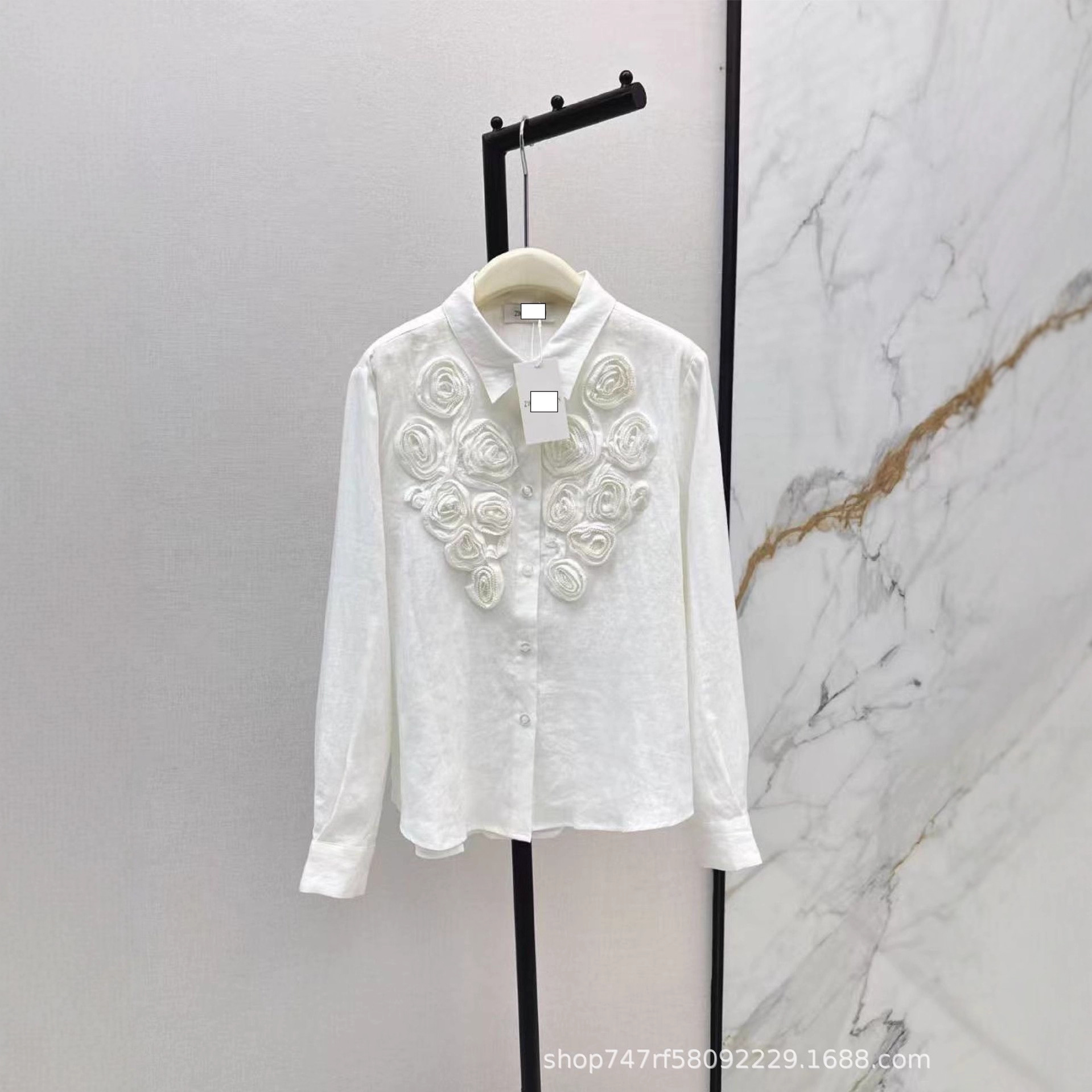 深圳南油25秋冬高端女装亚麻立体花朵白色衬衫
