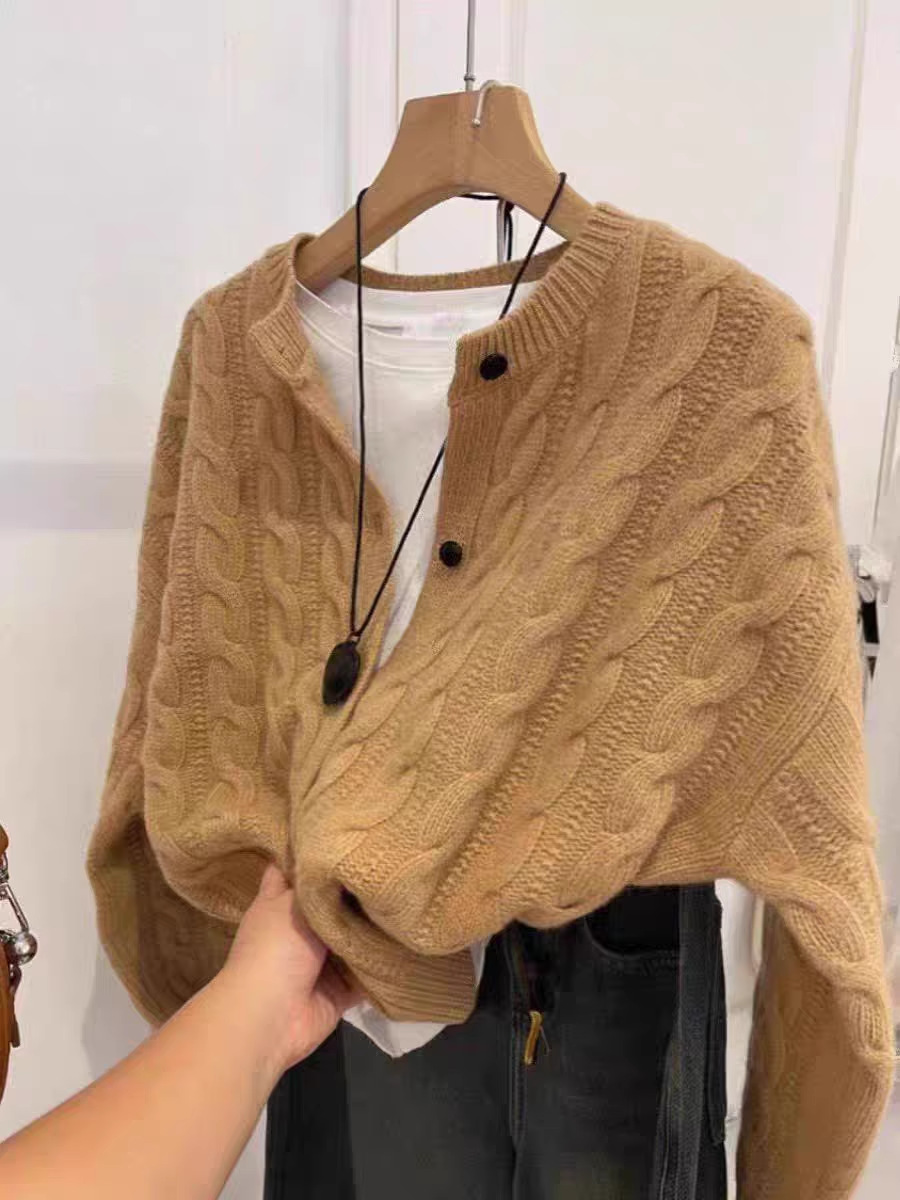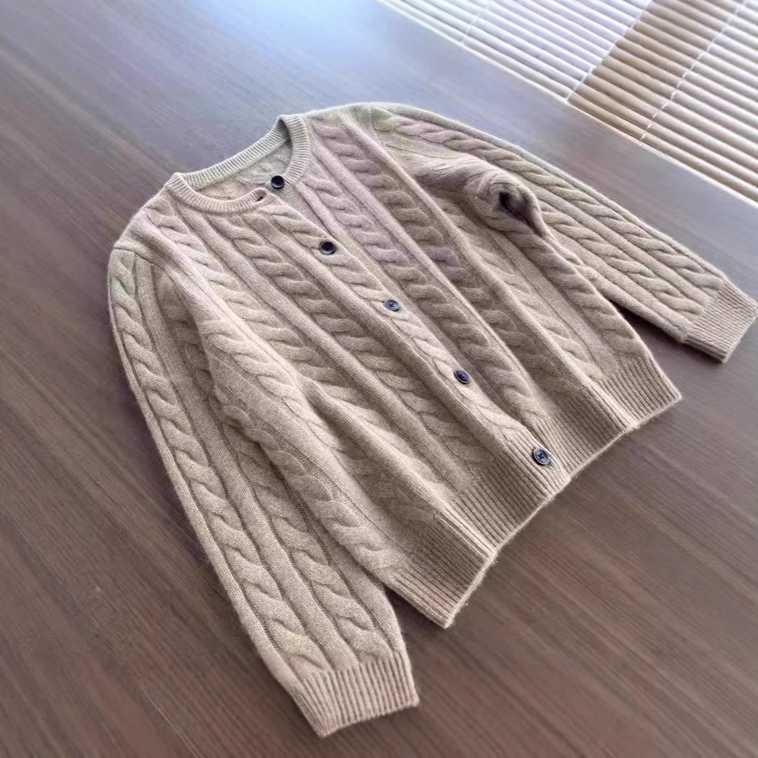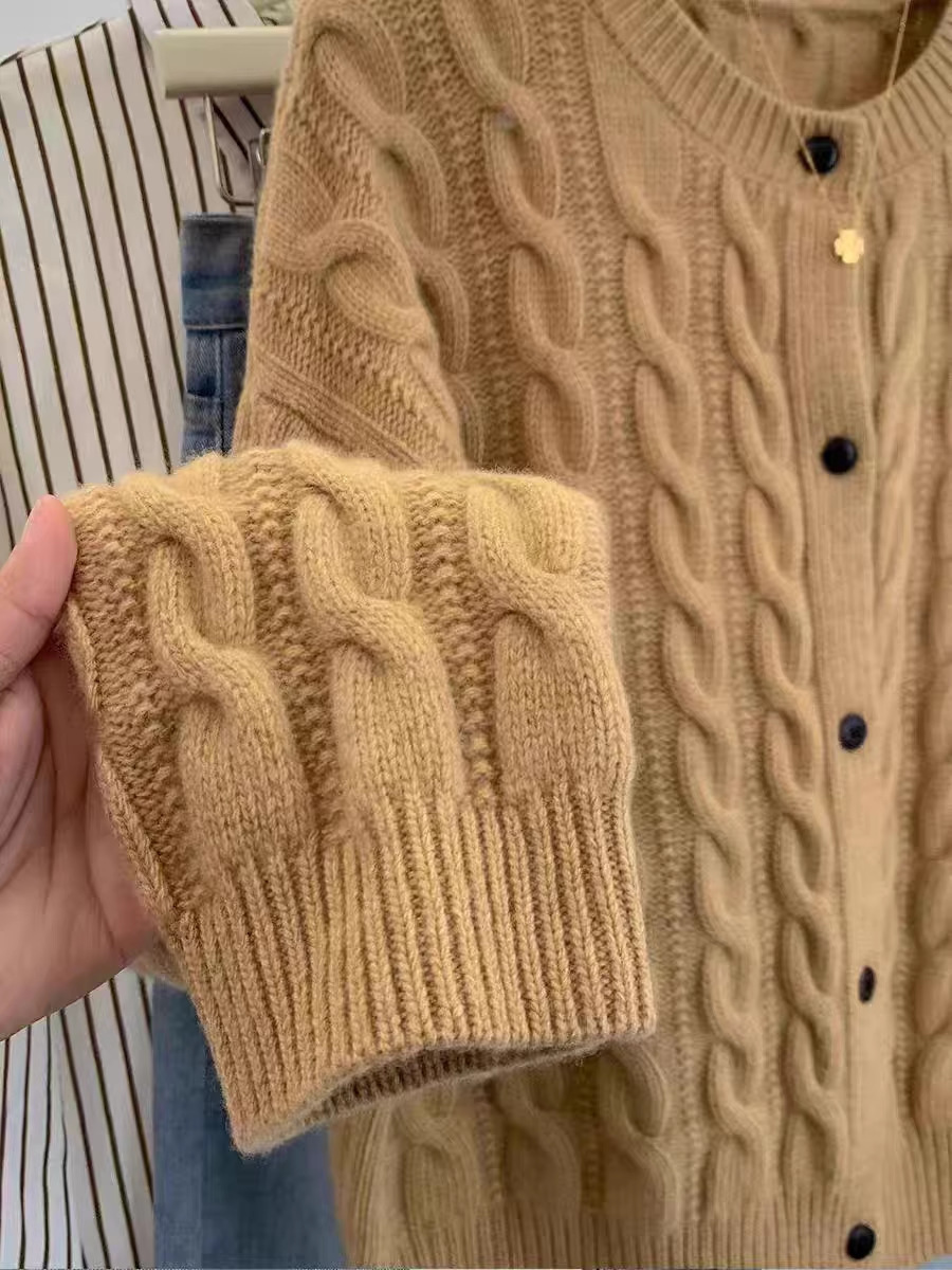 100%纯羊毛开衫女圆领麻花加厚羊绒针织衫秋冬复古慵懒风毛衣外套