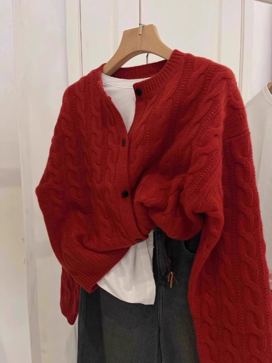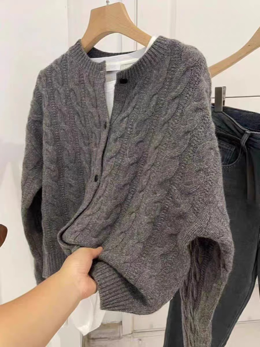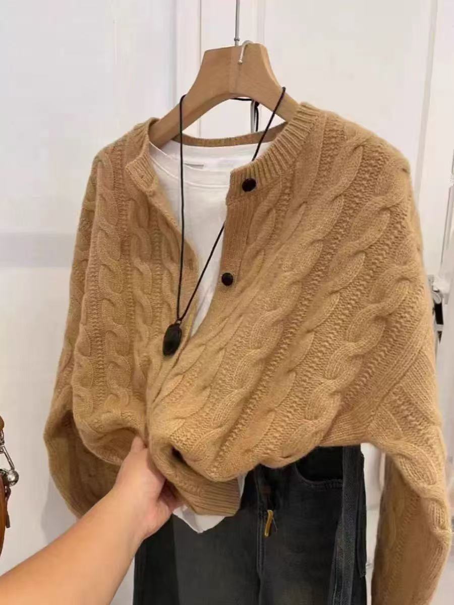 100%纯羊毛开衫女圆领麻花加厚羊绒针织衫秋冬复古慵懒风毛衣外套