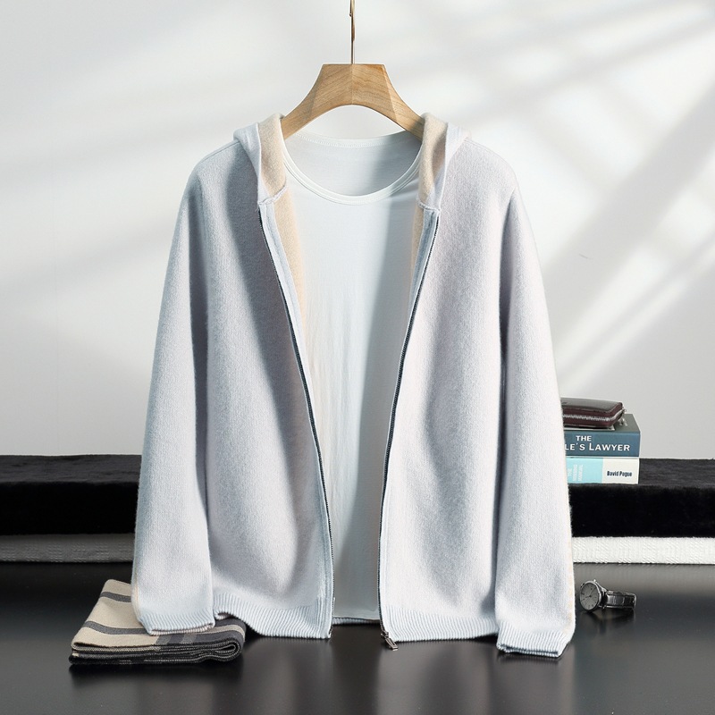 十二針四平空気層カシミヤ男性フード付きカーディガン秋冬新作衝突色デザイン感ニットコート