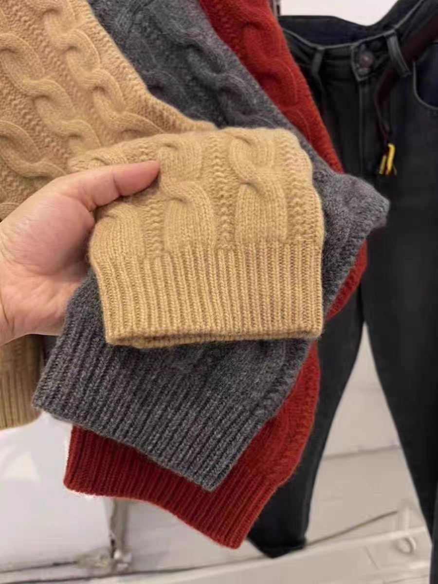 女式圆领纯羊毛长袖内搭纯色扭花设计打底衫秋冬新款亲肤套头毛衣